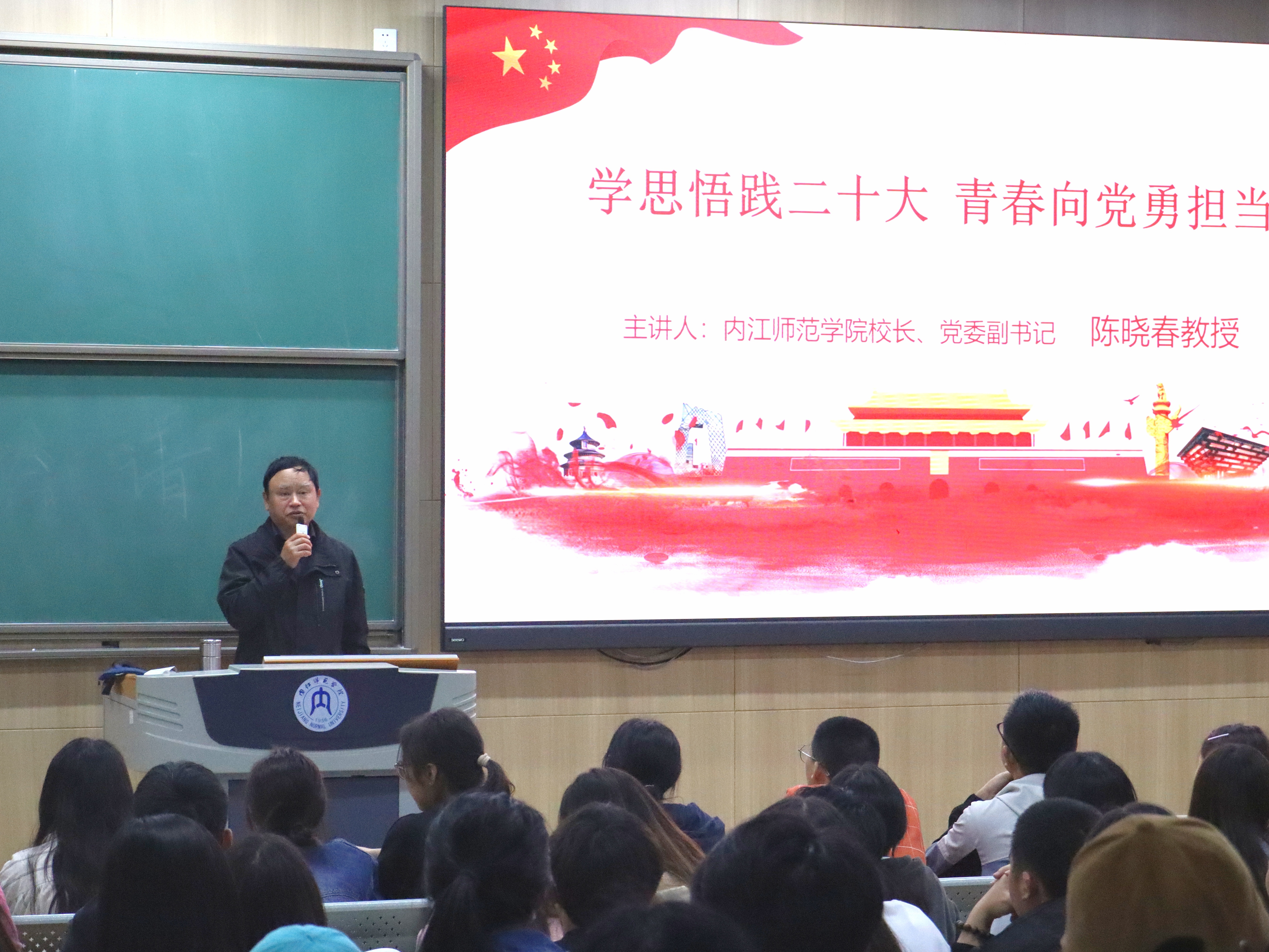 陈校长为联系班级作了“学思悟践二十大 青春向党勇担当”主题教育学习专题讲座。在讲座中,陈校长向同学们介绍了党的二十大会议内容和精神内涵,回顾了党的发展历程。陈校长指出,当代大学生应高举中国特色社会主义旗帜,全面贯彻新时代中国特色社会主义思想,弘扬伟大建党精神,自信自强、守正创新,踔厉奋发、勇毅前行,将习近平总书记的一系列重要论断内化于心、外化于行,立志做有理想、敢担当、能吃苦、肯奋斗的新时代好青年,积极担起时代所赋予的责任与使命。随后,陈校长结合自己丰富的人生经验及当下的社会形势,表明青年大学生施展才干的舞台无比广阔,实现梦想的前景无比光明,勉励同学们自觉肩负起历史赋予的神圣使命,争做志存高远、勤于学习、敢为人先、顽强拼搏、团结奋斗的新时代好青年,让青春在全面建设社会主义现代化国家新征程上绽放绚丽之花。最后,陈校长走进同学之中,与同学们讨论学习、生活上的问题,为同学们解疑答惑。陈校长表示,与同学们一起学习,感受到了同学们的好学精神,看到了当代青年的热血向上的精神面貌,希望同学们能够坚定理想信念,不负时代众望,在奋斗中成就人生。