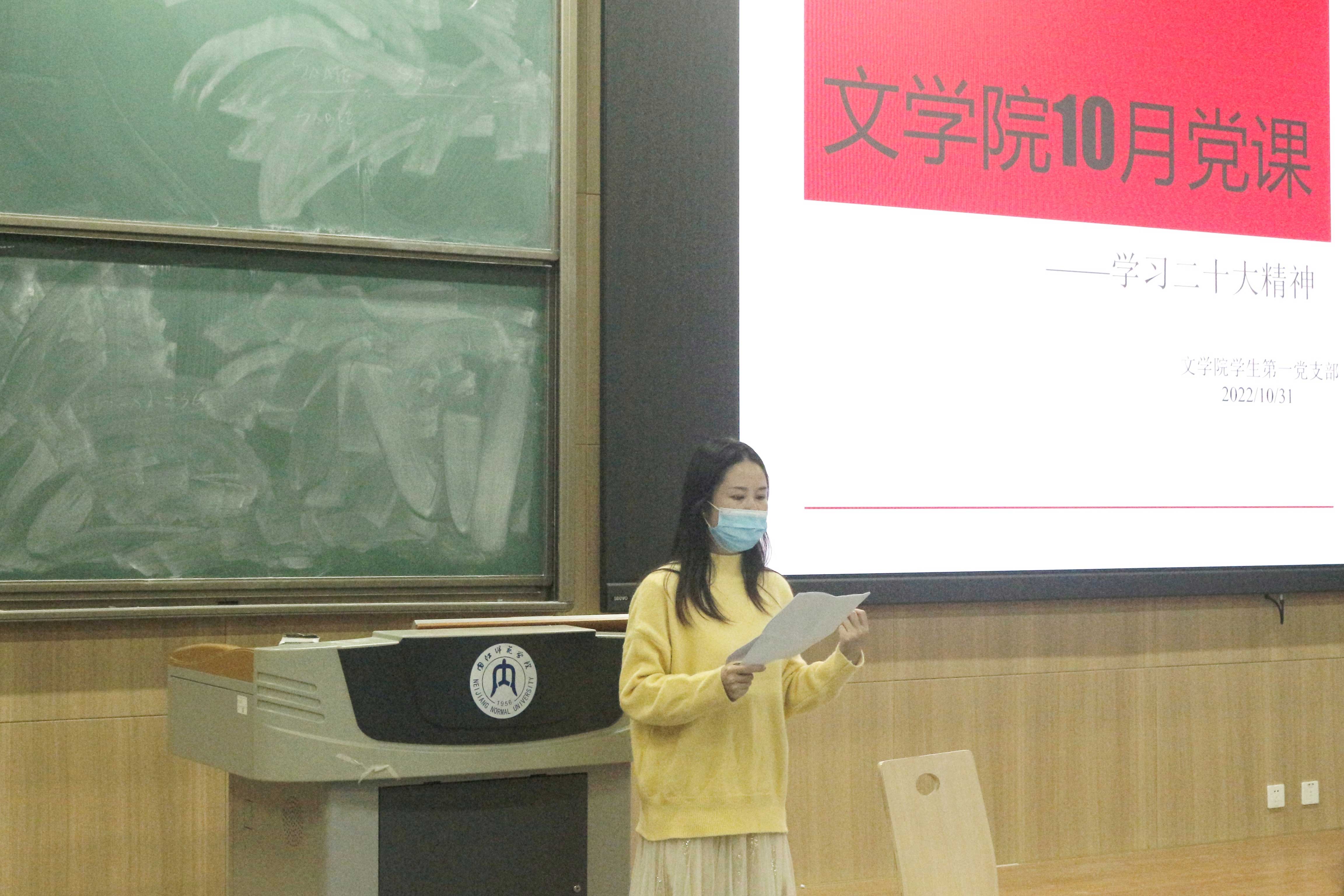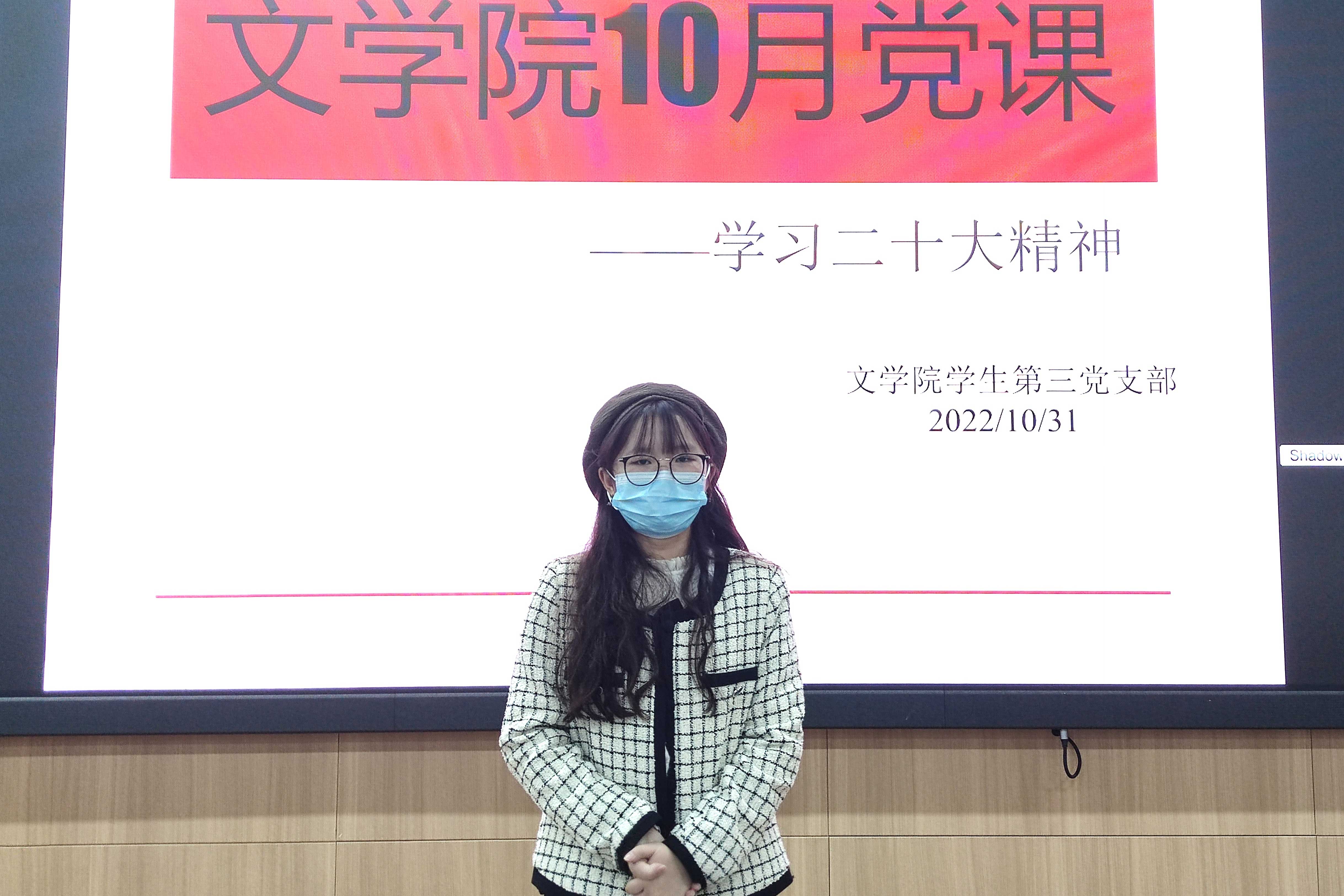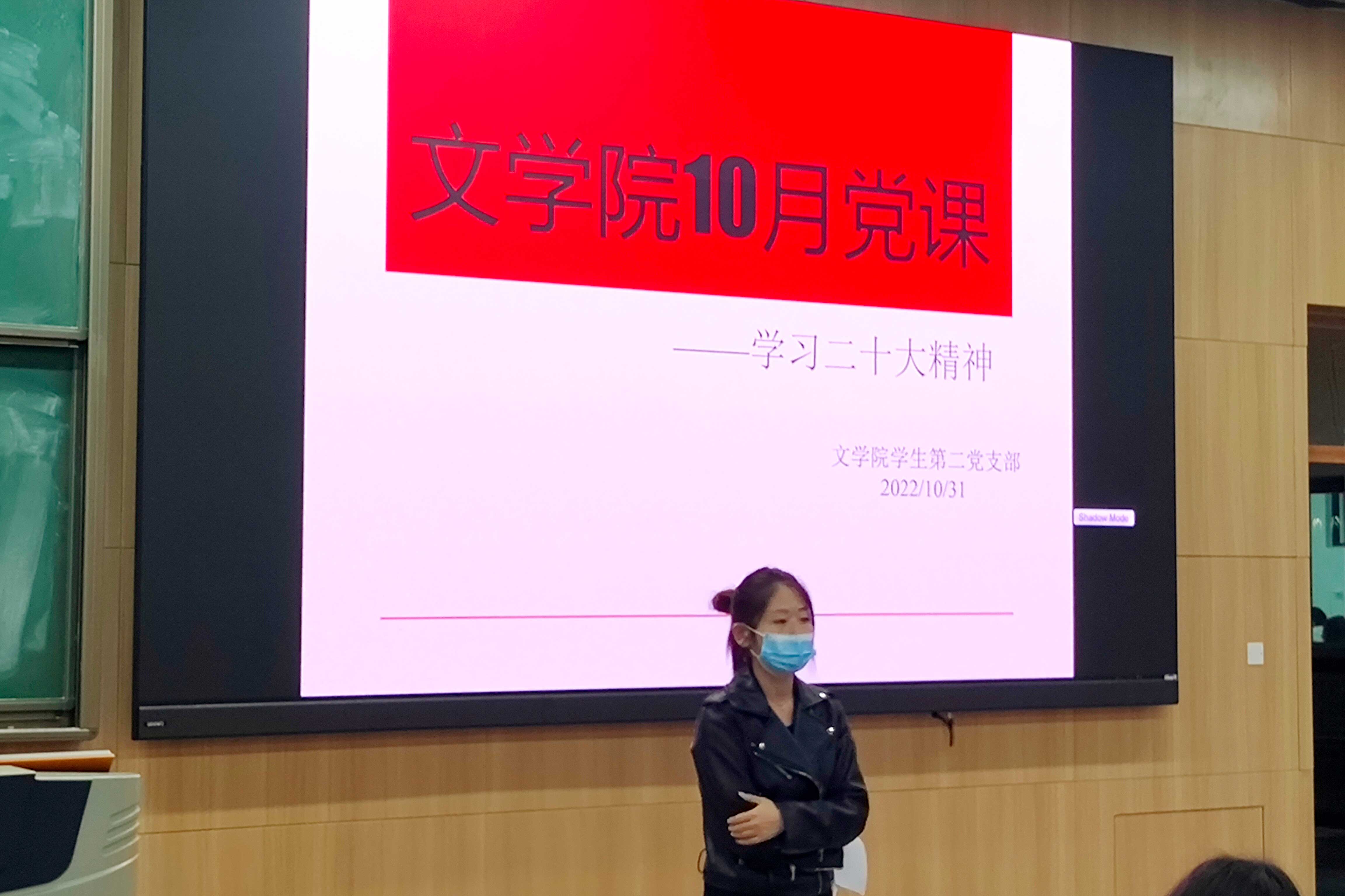 为深入学习贯彻党的二十大精神,进一步统一思想,提高认识。10月31日晚8点,我院第一学生党支部书记金夏,第二学生党支部书记汤靓,第三学生党支部临时负责人甘成望于明德楼B区112教室组织开展了以“解读二十大报告”主题的十月党课会议。本次党课以线上、线下相结合的方式开展,由党员工作部负责人许悦主持,我院学生各党支部全体成员参与。