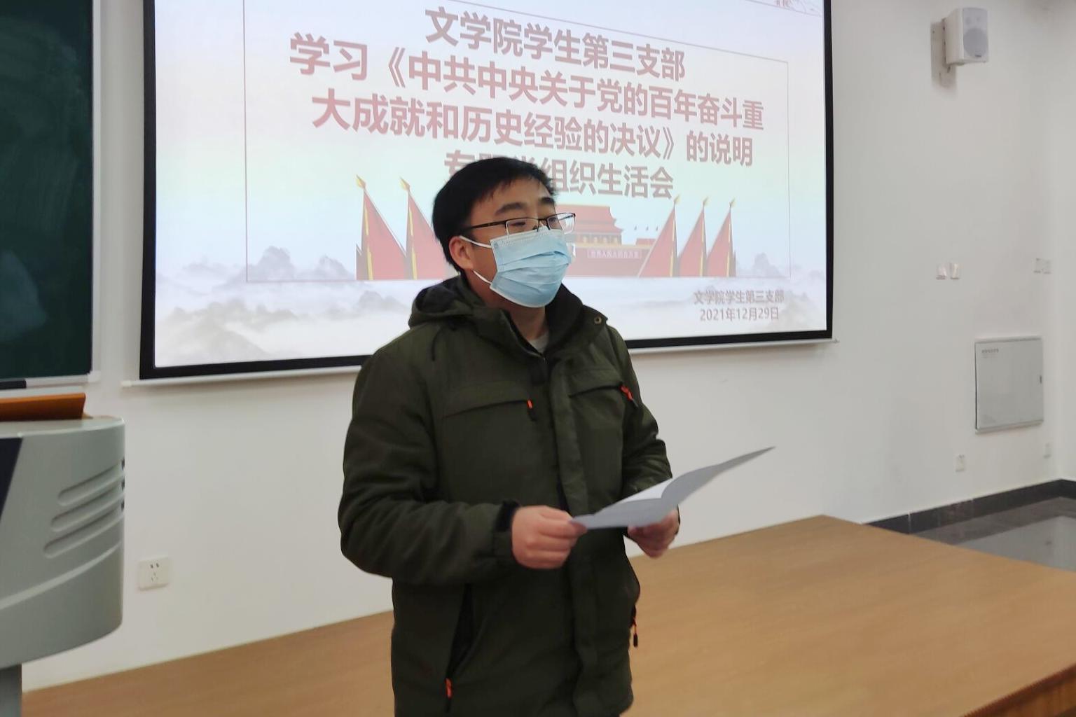 12月29日中午12点30分,我院学生第三党支部在明德楼B区102教室开展了关于学习《中共中央关于党的百年奋斗重大成就和历史经验的决议》的党课学习。此次学习由我院学生第三党支部书记孙波主持,第三党支部全体党员参与。