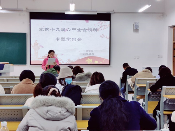11月22日下午,文学院组织全体教职工专题学习党的十九届六中全会精神。学习会由党总支副书记(主持工作)周艺主持。