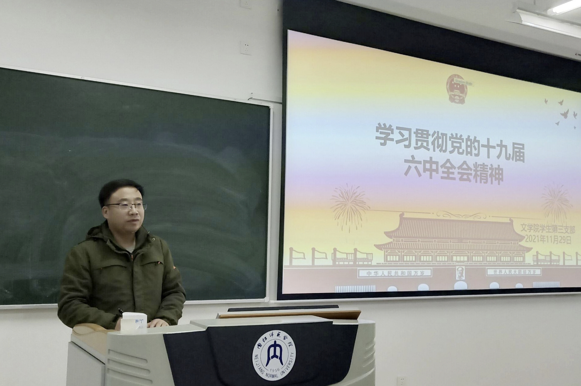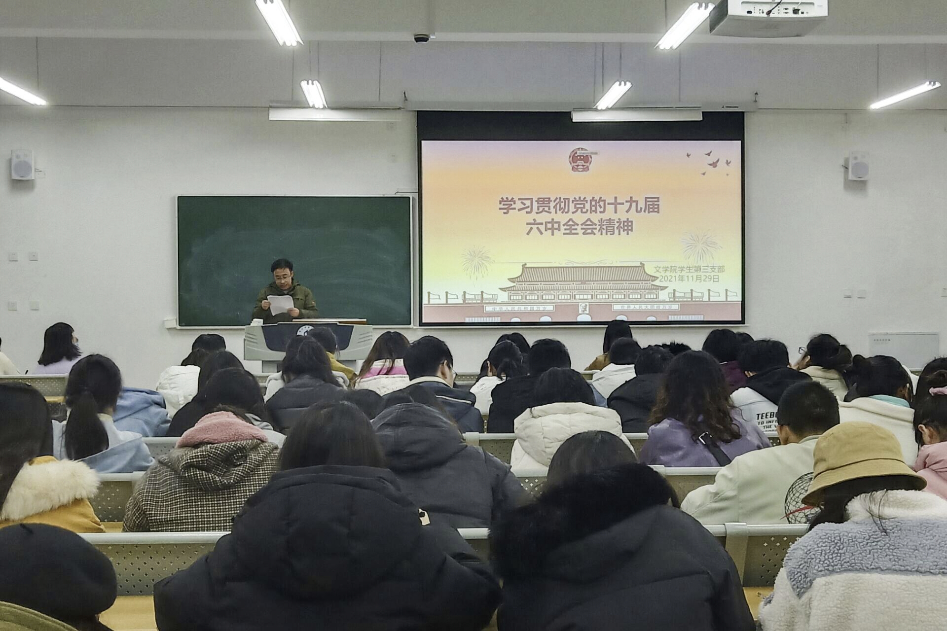 为了深入学习贯彻习近平新时代中国特色社会主义思想,进一步统一思想、统一意志、统一行动,我院学生第三党支部于11月29日晚7点在明德楼B区101教室开展了“学习贯彻党的十九届六中全会精神”为主题的党课学习。此次会议由第三支部书记孙波主讲,第三党支部全体成员参与。
