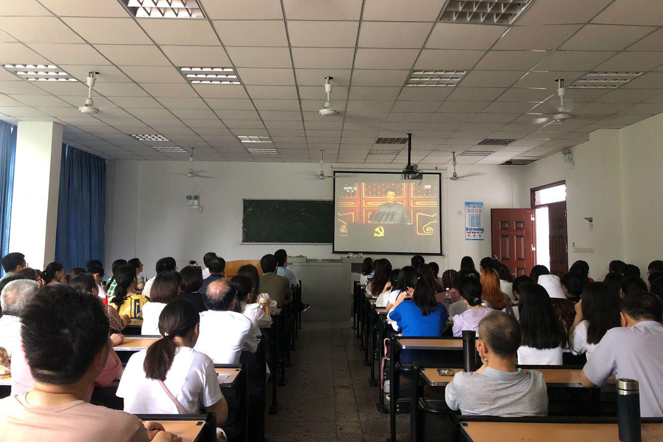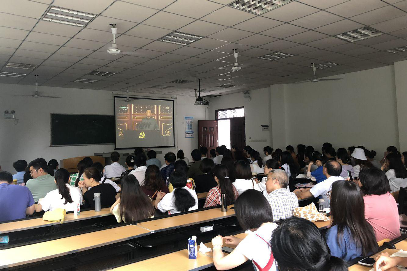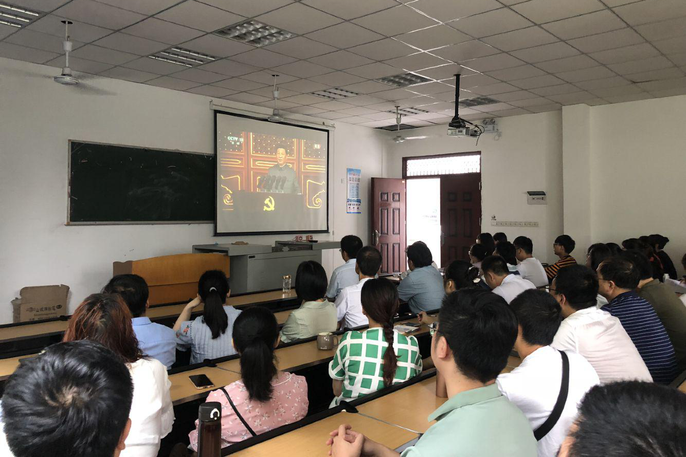 7月1日上午8时庆祝中国共产党成立100周年大会在北京天安门广场隆重举行。我院党总支书记李达军,副院长梁明玉、张文彬,党总支副书记刘正丽,辅导员许小涛、汤靓、孙波、金夏,部分任课老师以及部分同学在中文楼203教室共同观看大会转播实况。