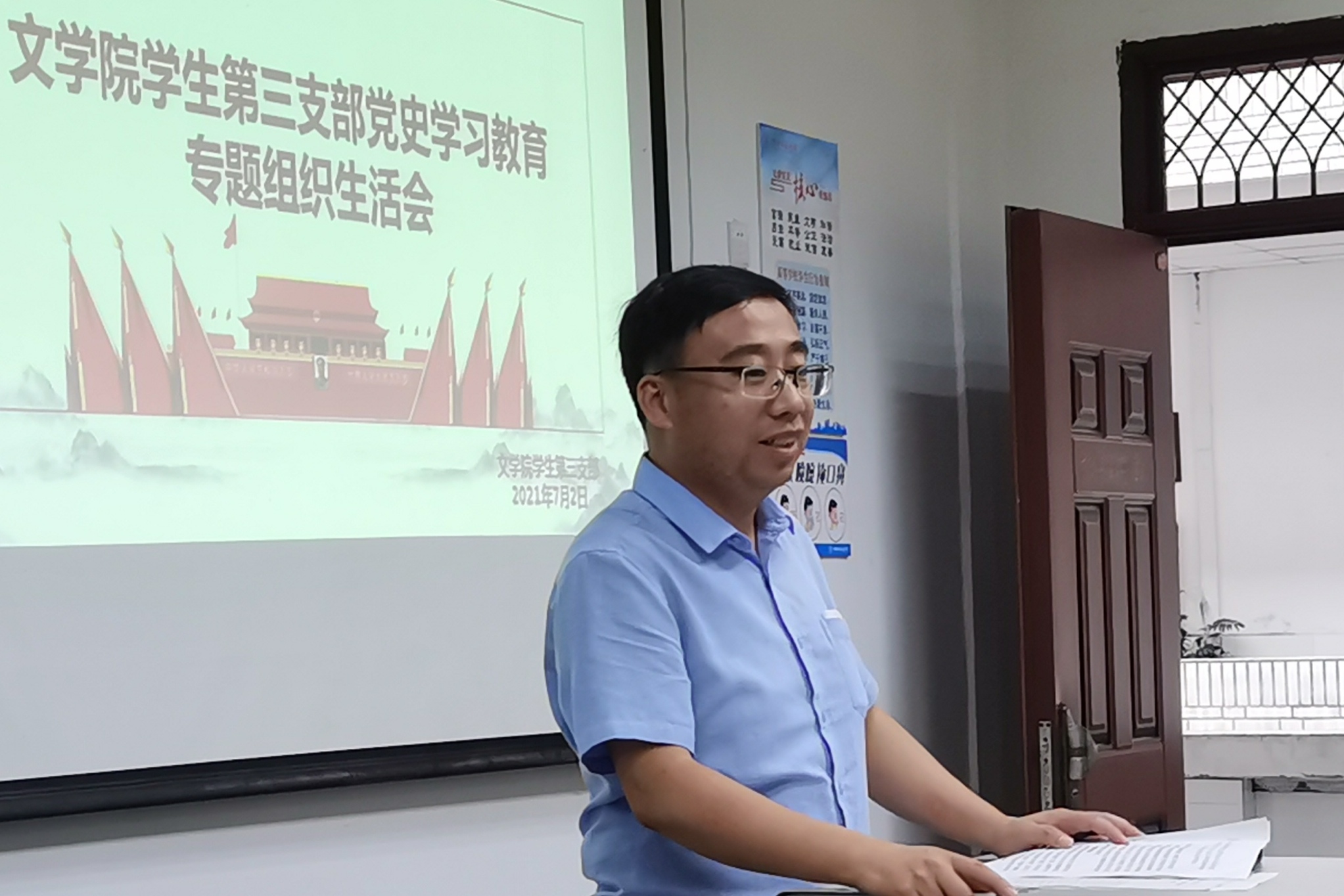 为了使广大师生党员铭记中国共产党百年奋斗的光辉历史,不忘中国共产党始终不渝为人民谋幸福的初心,7月2日晚上7点,我院学生第三支部在中文楼203教室举行了支部党史学习教育专题组织生活会。第三支部书记孙波主持会议,第三支部全体党员参与。