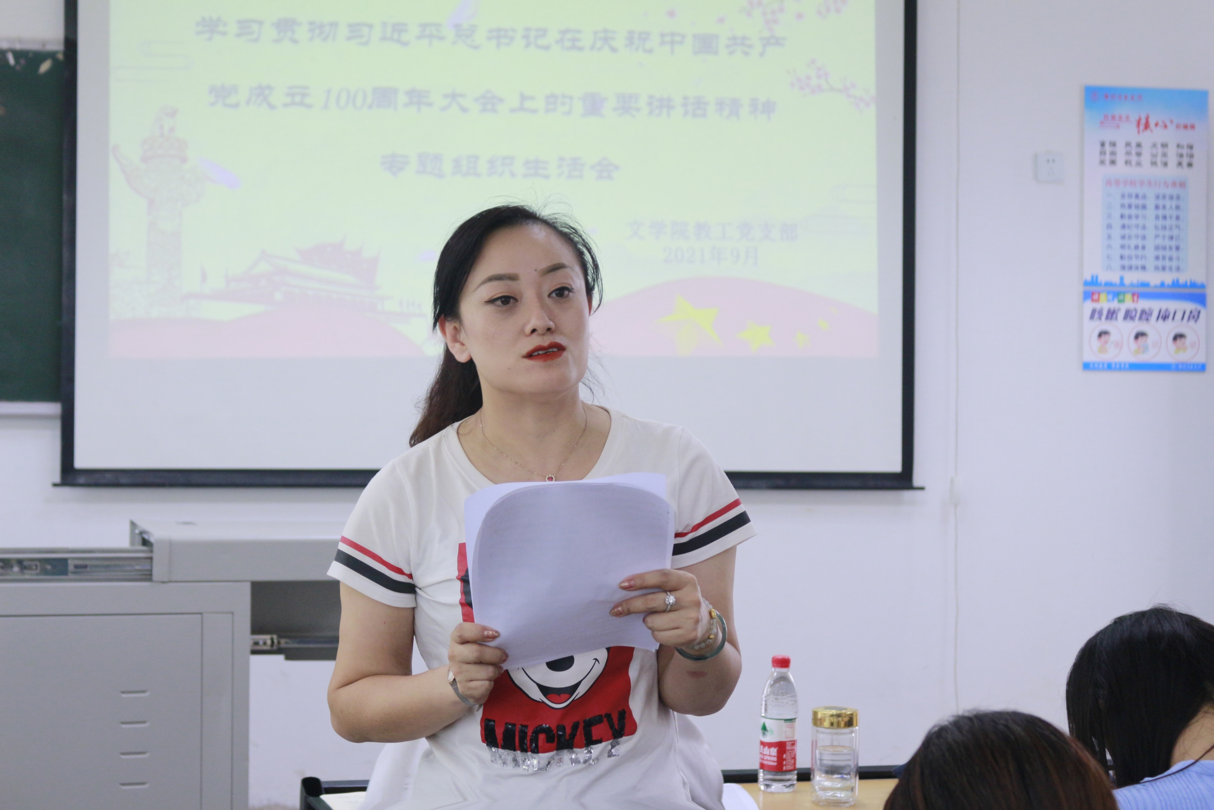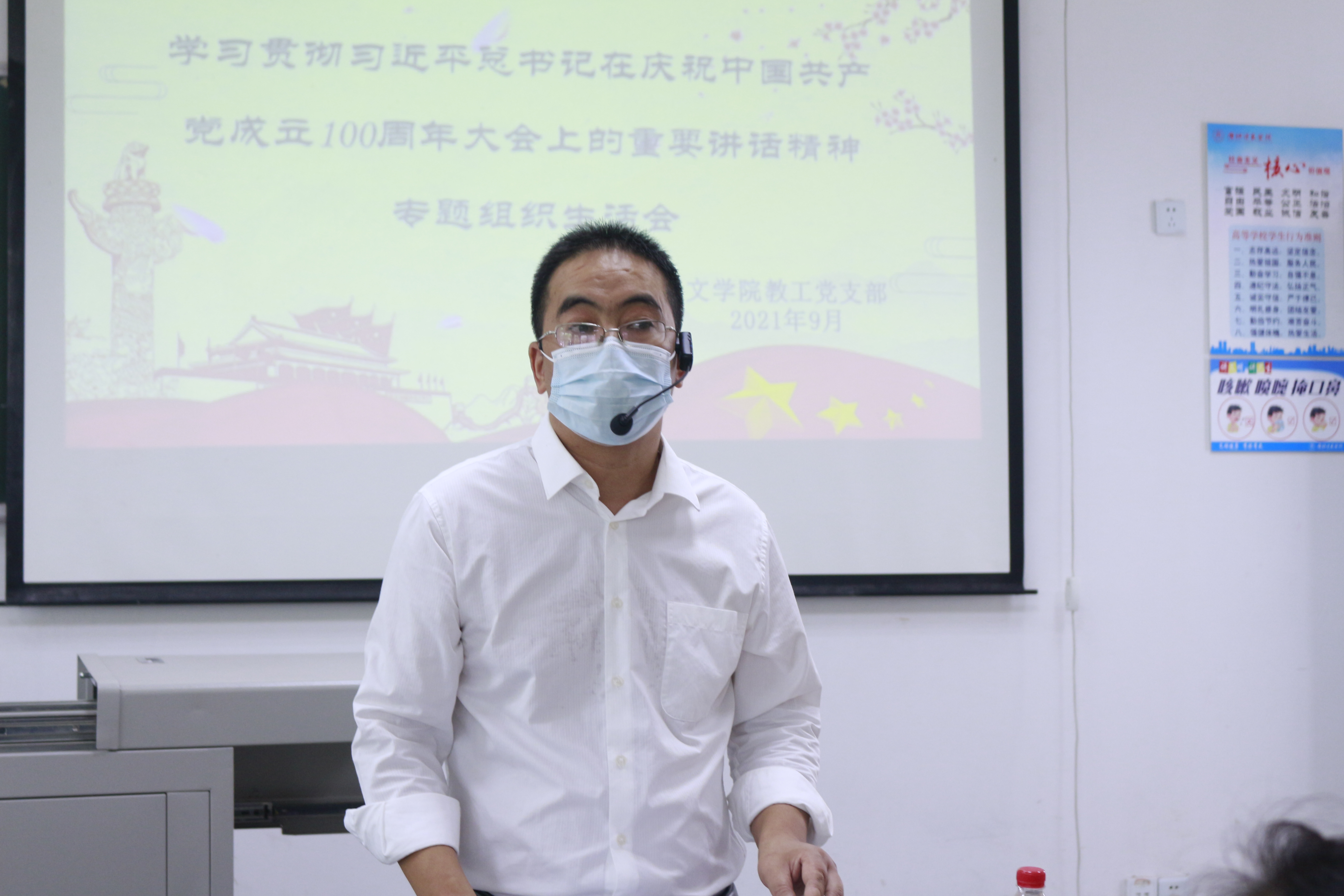 为认真贯彻落实“学史明理、学史增信、学史崇德、学史力行”的总体要求,引导党员同志增强“四个意识”、坚定“四个自信”、做到“两个维护”,大力弘扬伟大建党精神,9月6日下午2点30分,我院教工党支部在中文楼203教室召开学习贯彻习近平总书记在庆祝中国共产党成立100周年大会上的重要讲话精神专题组织生活会,受教工支部书记黄全彦同志委托,李达军同志主持本次会议。学校党委副书记、校长陈晓春同志以普通党员身份参加了此次专题组织生活会。