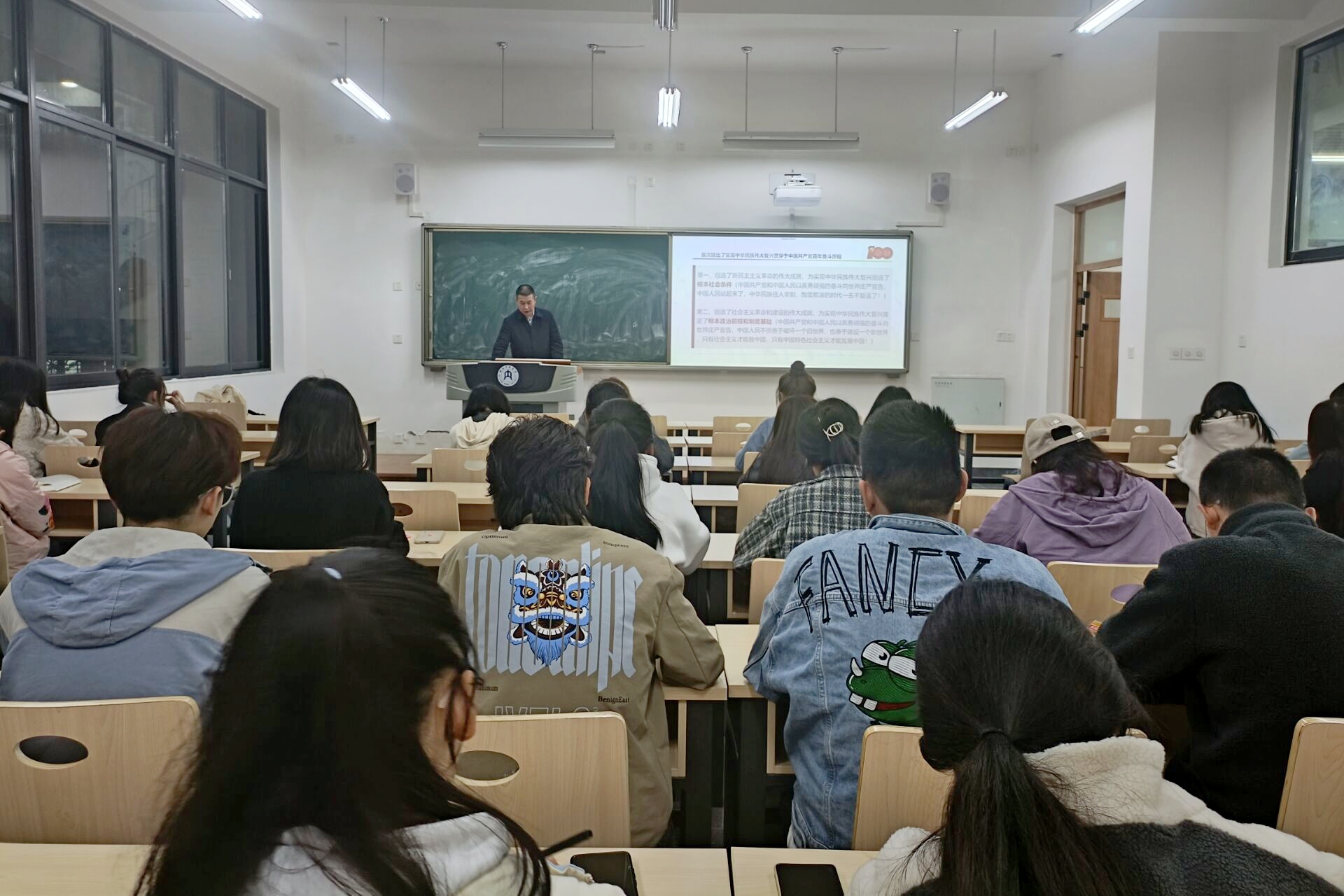 在正式进入课程之前,严书记贴心地询问同学们搬进新校区后的生活状况以及学校的后勤工作。课堂上,严书记主要针对习近平总书记的七一讲话,并以“沿着不可逆转的复兴之路奋勇前进”为课题,为在座的各位同学描绘了伟大祖国的宏伟蓝图。首先,严书记从中国共产党的历史、中华人民共和国的历史、中华民族的发展史、世界社会主义发展史、人类社会进步史上五个方面带领同学们深入领会习近平总书记“七一”重要讲话的重大意义。随后,严书记从深入领会党团结带领人民不懈奋斗的光辉历程和伟大成就的角度出发,让同学们深刻体会到中国共产党在中国特色社会主义道路建设中的重要地位。紧接着,严书记用“坚持真理、坚持理想,践行初心、担当使命,不怕牺牲、英勇斗争,对党忠诚、不负人民”这32个字,向同学们传达了伟大的建党精神,帮助同学们深入领会伟大建党精神的深刻内涵。最后,严书记再次强调大家要把学习贯彻习近平总书记重要讲话精神作为一项重要的政治任务抓紧抓好,并且领会以史为鉴、开创未来的根本要求,坚持“九个必须”。