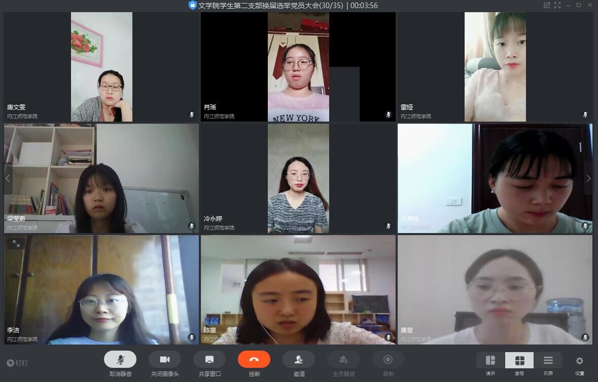 6月4日下午,我院学生各党支部利用“钉钉”软件召开了线上学生党支部换届选举委员大会,会议分别由第一党支部负责人付志新、第二党支部负责人曾晓芸、第三党支部负责人林远航主持,各支部正式党员、预备党员参与此次会议。