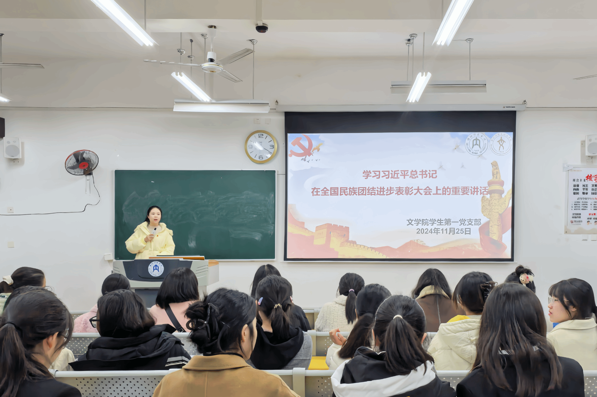 11月25日晚8点,我院学生第一党支部在明德楼B区102教室开展了一场以“学习习近平总书记在全国民族团结进步表彰大会上的重要讲话”为主题的专题党课。支部书记金夏主讲,支部党员及预备党员积极参与。