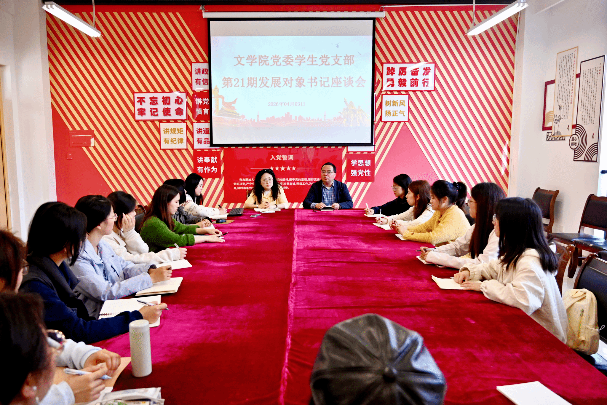 为进一步严把党员“入口关”,提升发展对象思想政治素养,2026年4月3日下午4点30分,我院召开第21期学生党支部发展对象座谈会。学院党委书记周艺,党委副书记、纪委书记周琼,学生支部书记及第21期学生党支部发展对象参加会议。