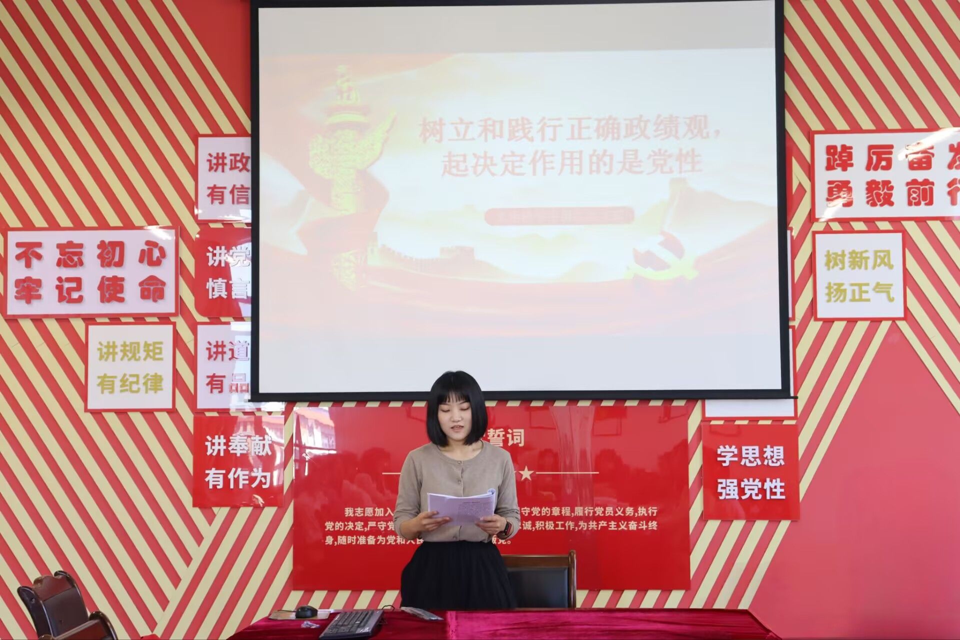 支部书记雷业老师围绕党性与政绩观的内在联系展开细致讲解。雷老师明确指出,党性是党员立身、立业、立言、立德的根本,一名党员能否树立、践行正向端正的政绩观,最核心、最关键的决定性因素便是自身党性修养。只有筑牢党性根基,守住思想本心,才能找准价值方向,真正读懂政绩观的内涵本质。