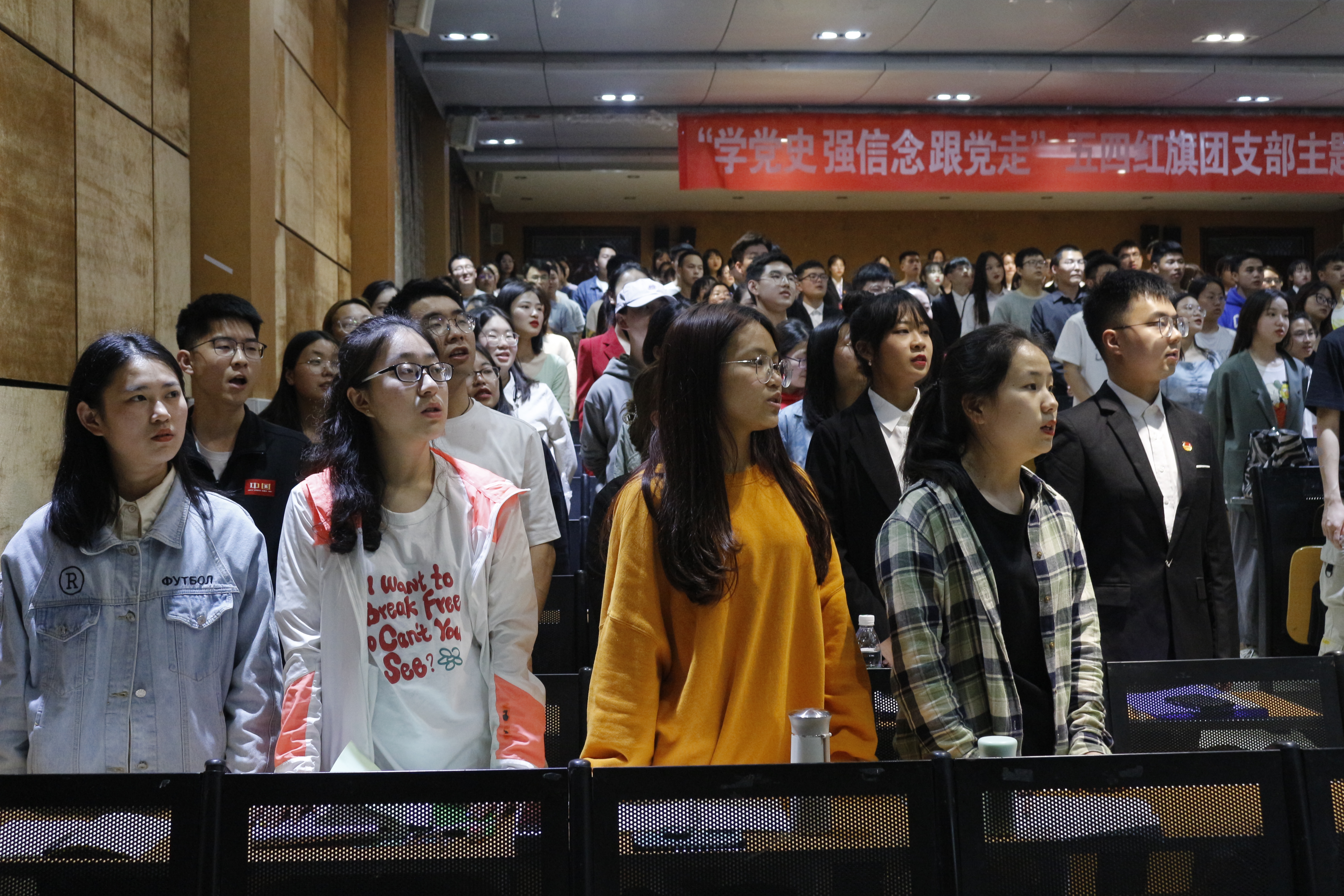活动伊始,伴随着音乐声响起,全体肃立共唱团歌。接着,主持人宣布评分准则,16个二级学院依次进行汇报表演。我院2018级4班团支部主题团日活动主要分两部分展示。首先,柏涵膑同学向参会人员介绍团支部日常活动,主要包括“一心向党,搞好支部建设;锐意进取,推进学风建设;扬帆起航,提高生活素质;青春同行,彰显服务精神;群英荟萃,展示团队魅力”五个方面。团支部成员认真践行五四青年精神,展示出我院学子良好的综合素质。紧接着,柏涵膑和赵佳楠带来2018级4班团支部原创诗歌朗诵《致青年》,他们用铿锵有力的声音和情感真挚的语言表达了青年一代对祖国的热爱之情,激励着同学们不忘初心,砥砺前行。