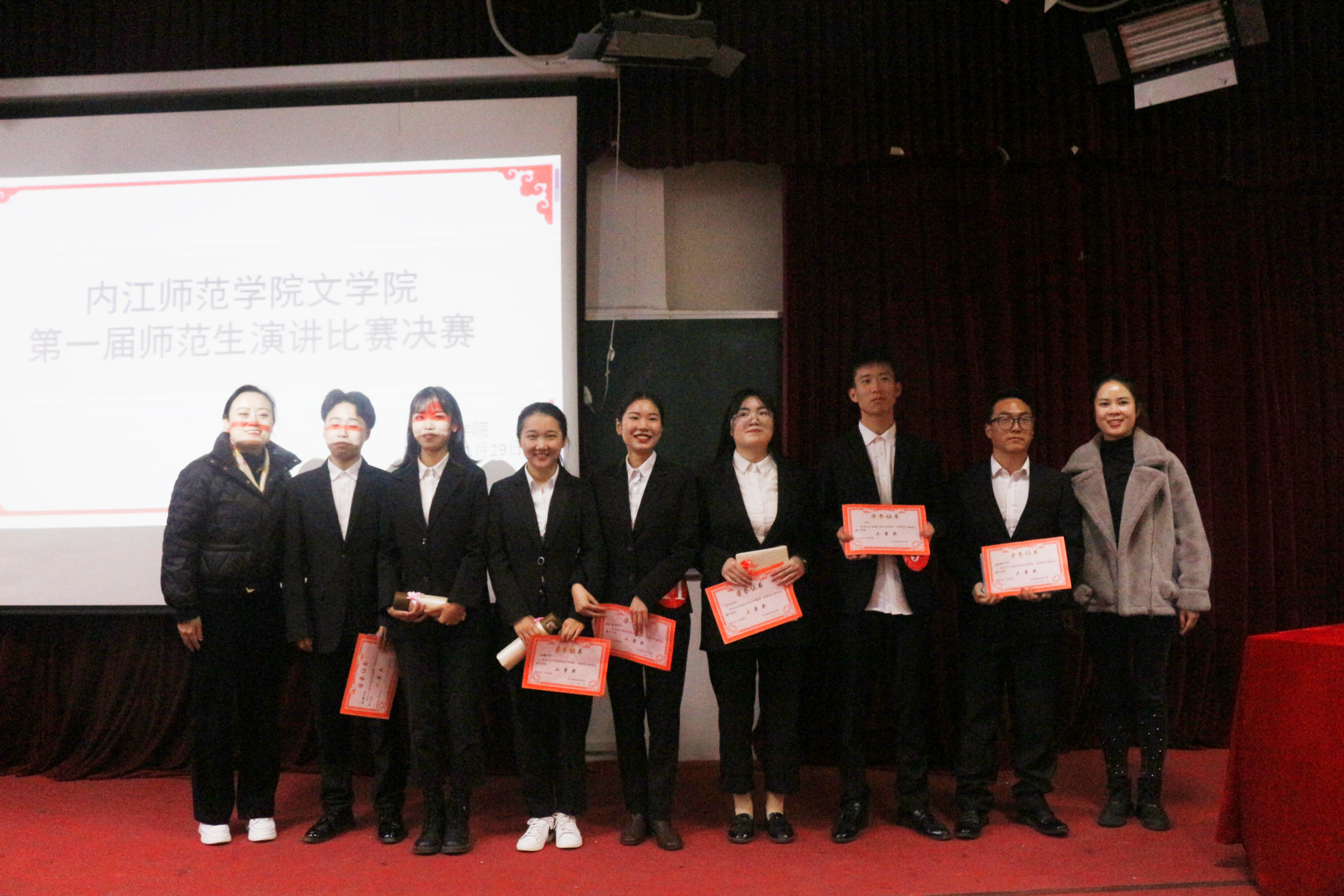 经过激烈的比拼,2018级1班苏铭荣获一等奖;2018级1班何倩、2018级1班曹洪曼与2020级3班罗琪并列荣获二等奖;2018级1班吉克克的、2019级1班李静静、2019级1班李加乐荣获三等奖。最后,刘书记和金老师上台为获奖选手颁发奖状,并在观众热烈的掌声中与他们合影留念。