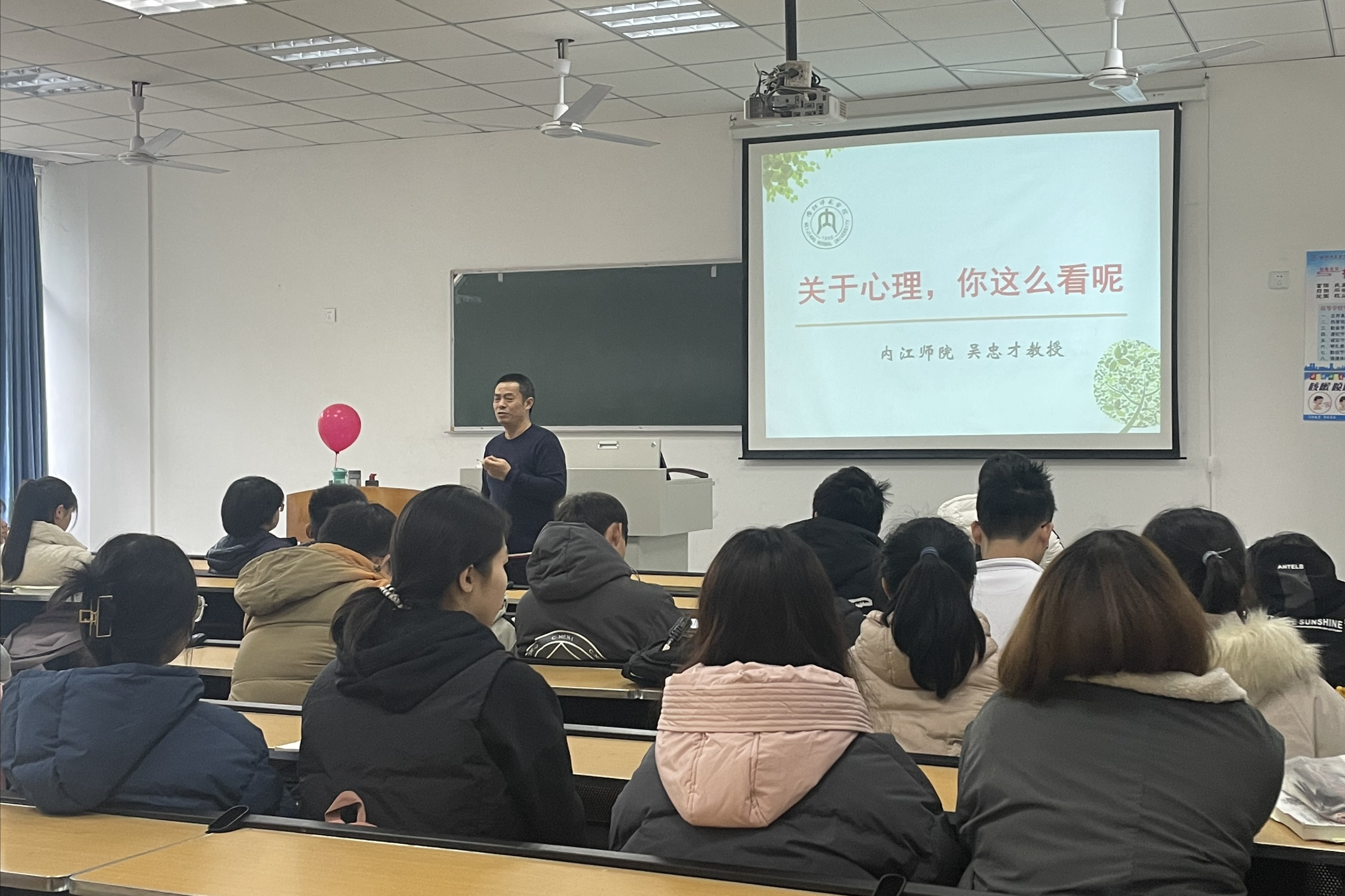 为加强学生心理健康教育,帮助同学们正确认识心理健康,有效应对各种压力导致的情绪问题,提供心理健康自助策略,12月2日下午2点到4点,学院于中文楼202教室开展了主题为《关于心理,你怎么看呢》的心理健康专题讲座。学院特邀学校心理咨询中心吴忠才教授担任主讲人,文学院党总支副书记刘正丽、辅导员孙波、大一新生及各班级心理委员到场聆听。