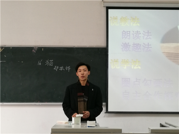 比赛伊始,主持人首先上台介绍了本次比赛的宗旨及到场的评委,宣读并讲解了比赛要求以及评选规则。随后,选手们的比赛正式开始,参赛选手们在8分钟说课讲读中展现出了对课堂教学的整体把握和良好的专业师范技能,通过多种独特创新的说课方式阐明了自己对说教材、说教学目标、说教学重点、说教法等七个说课关键部分的理解,并做出简短精炼的分析。在说课过程中选手们还通过增加解说作者生平背景来丰富说课环节的内容,充分反映出了他们对待比赛认真、赛前准备充分的积极态度。同时,选手们说课篇目多样,分别有《紫藤萝瀑布》、《爱莲说》、《咏雪》等名篇,可以看出选手们对中学课堂教学准确熟练的把握。
