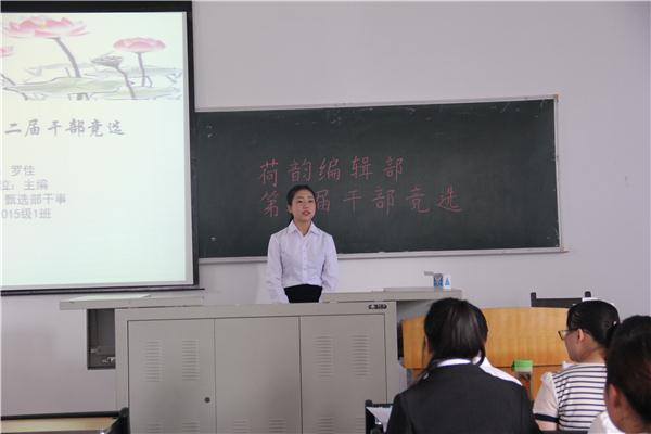 6月6日下午2点30分,文学院荷韵编辑部第二届干部竞选于中文楼301教室举行。此次竞选评委为荷韵编辑部主编匡星星,副主编、排版组部长庞红雨,较对组部长王倩,宣传组部长肖婷,美编组部长曾念,甄选组部长廖红梅。荷韵编辑部有13名干事参加了此次竞选。