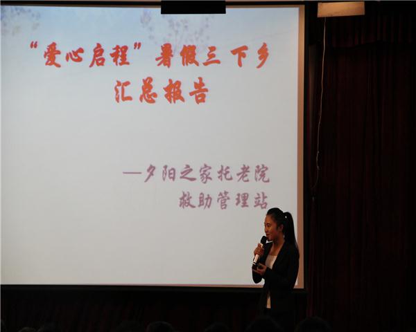 第一支上场的团队是“爱心启程”服务队,团队指导老师是我院傅思忆老师。队长冯琳带领大家走进夕阳之家——托老院救助管理站。冯琳讲诉着养老院里面老人的情况,他们大多身患疾病,说话含糊不清。PPT上播放着冯琳团队在敬老院的爱心举动:为老人带去水果、剪脚趾甲、做饺子宴、和老人们聊天、帮助他们打扫卫生,虽然这些是家庭日常中很普通的行为,但是他们用自己满满的爱心将这些普通行为落在与自己毫无血缘关系的陌生老人身上,记录他们行为的一张张与老人的互动图片让现场不少观众眼圈湿润。