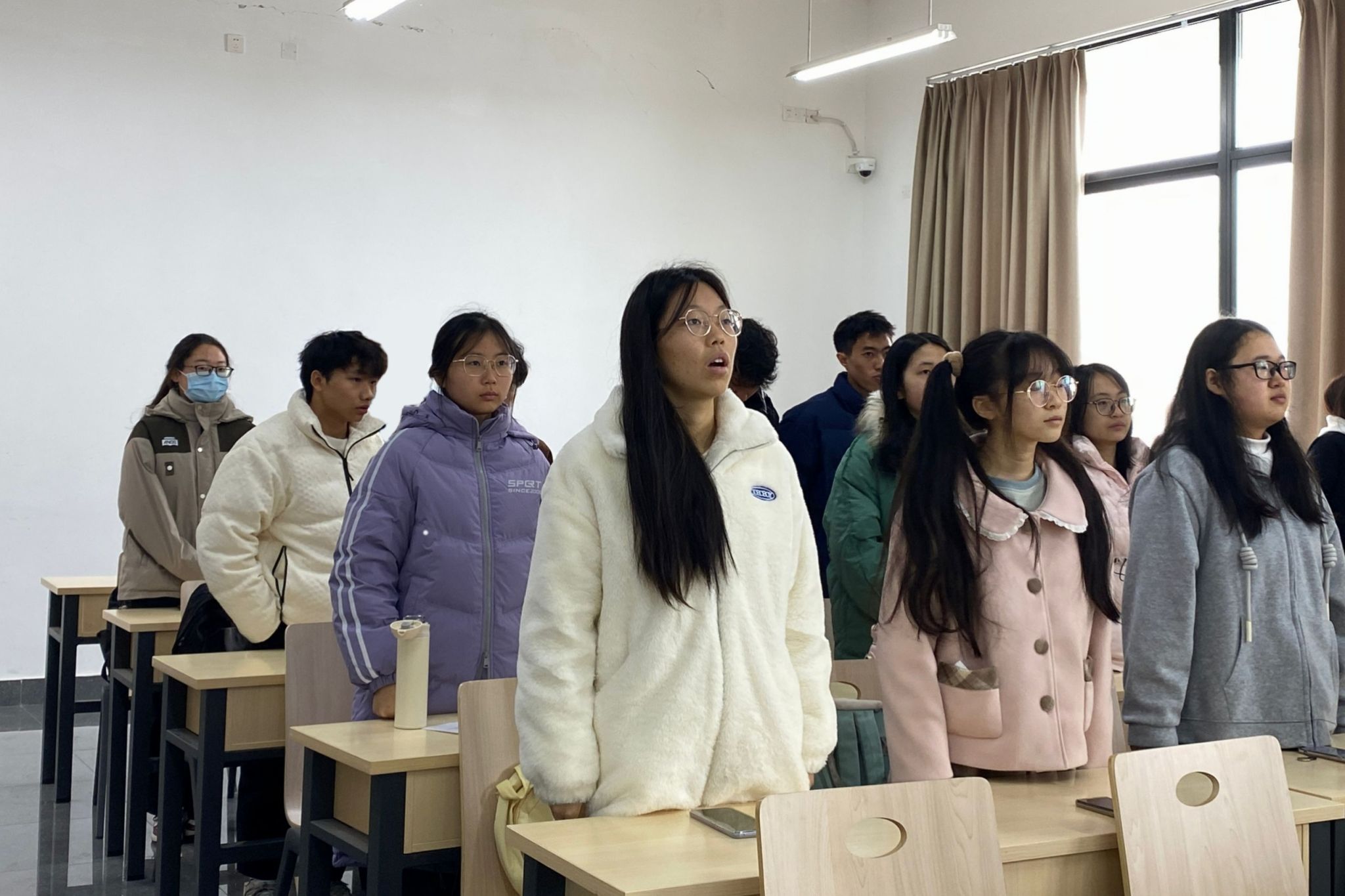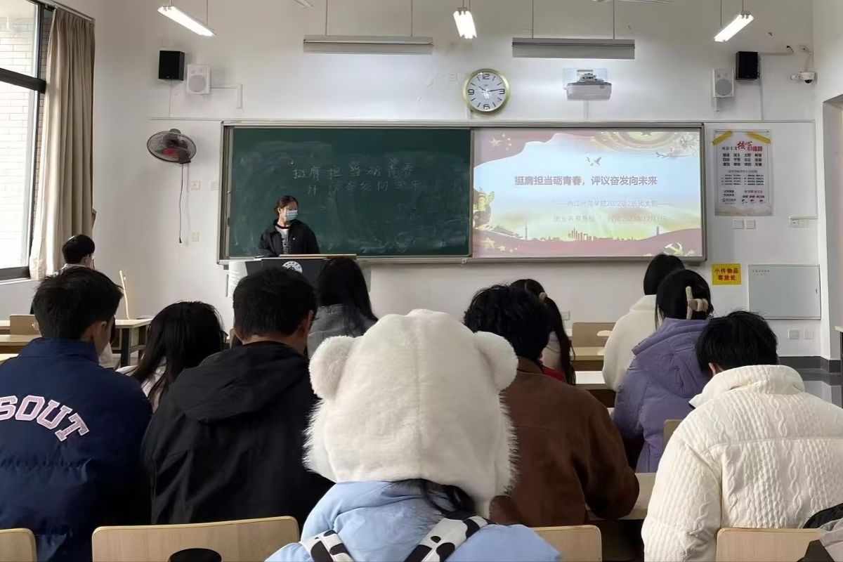 团课伊始,全体成员齐唱团歌。紧接着,在各班团支书的带领下,团员青年们认真学习《习近平著作选读》、《习近平新论党的青年工作》等文章,体悟领会了习近平新时代中国特色社会主义思想的精神内涵。在学习过程中,大家交流沟通,明晰了作为新时代青年大学生,要从党史学习中激发信仰、获得启发、汲取力量,不断坚定“四个自信”,不断增强做中国人的志气、骨气、底气,树立为祖国,为人民永久奋斗、赤诚奉献的坚定理想。随后,团支部书记、委员、其他团员依序发言,同学们对其进行评议,肯定成绩、指出不足,激励委员们形成合力,提高工作针对性和实效性。接下来,各班辅导员点评讲话,作出总结,为此次民主评议画上圆满的句号。团课最后,全体成员起立重温入团誓词,誓词声铿锵有力,展现出广大团员青年对党和中国共青团的衷心热爱。