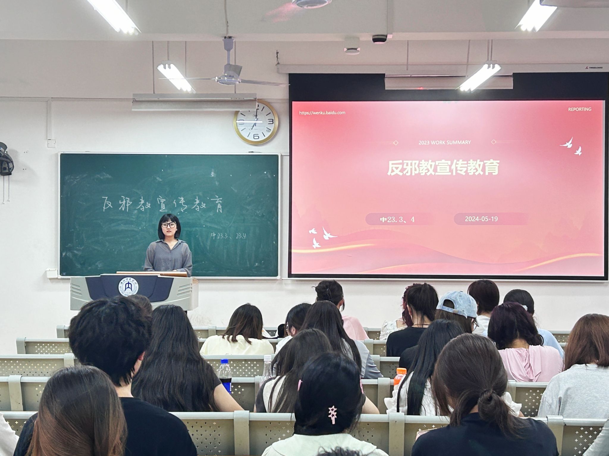 为提高同学们对邪教的警惕性,增强大家抵制邪教的意识和能力,我院组织各班开展了“反邪教宣传教育主题班会”。其中,5月19日晚上7点,我院2023 级3班、4班在明德楼B区202教室开展本次主题班会,此次班会由我院学工办辅导员雷业老师主讲,我院2023级3班、4班全体学生共同参与。