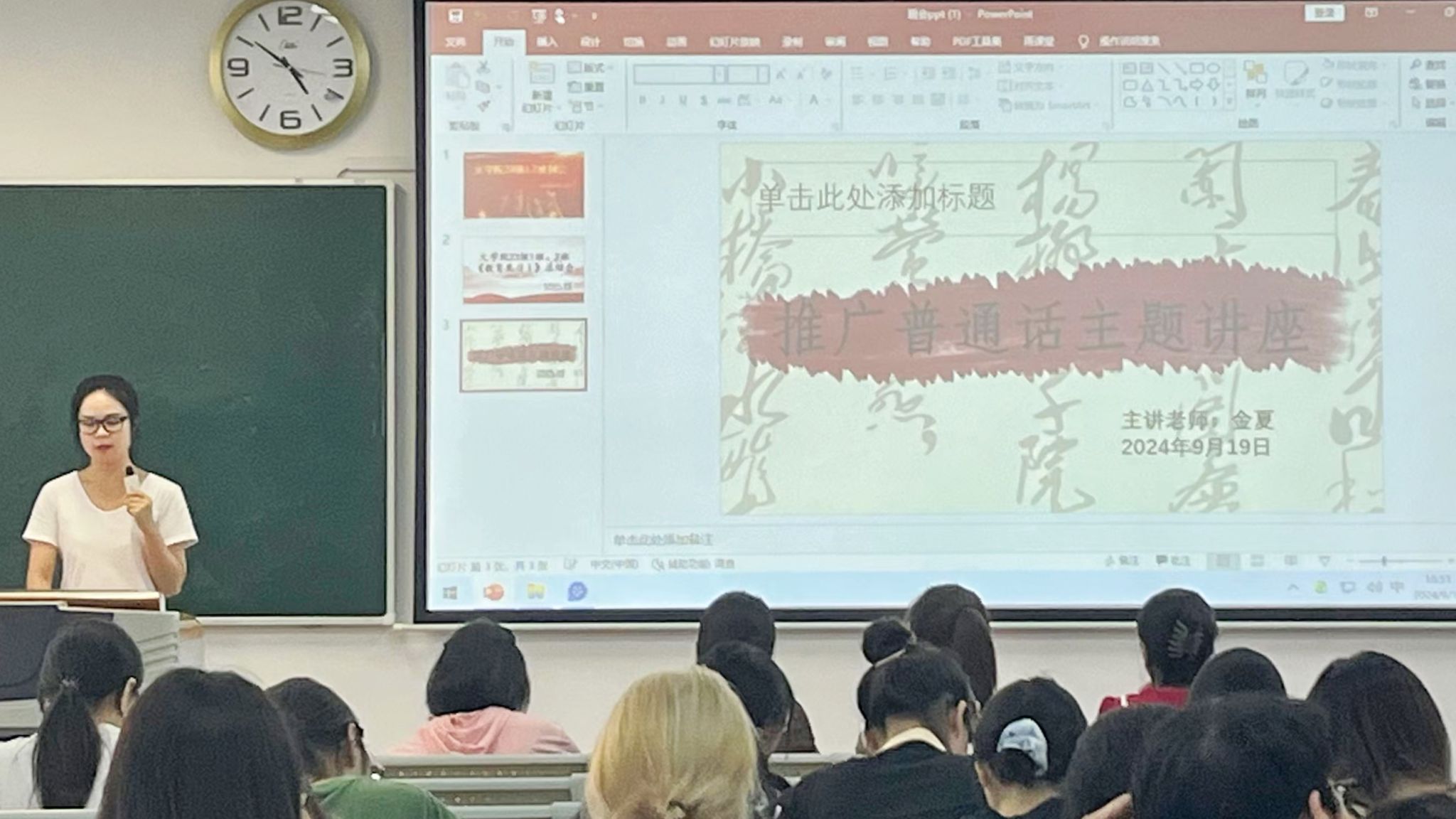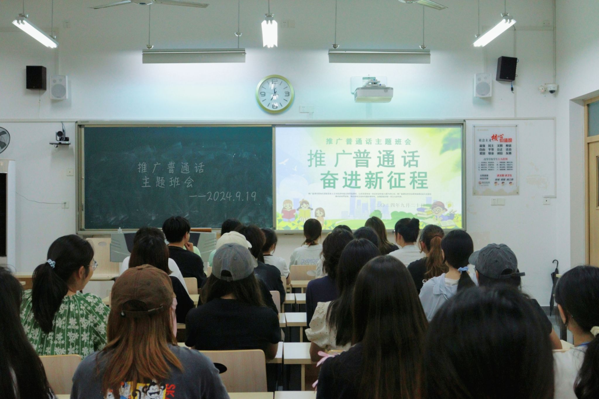为强化同学们对语言语音的认识,营造说好普通话的良好氛围,9月19日至20日,我院各班召开“推广普通话,奋进新征程”主题班会,我院全体学生共同参与。其中,我院2023级1班、2班于9月19日下午4点30分在明德楼B区101教室召开本次班会,班会由我院2023级1班、2班班主任金夏老师主讲,班级全体同学参与。