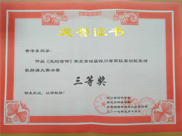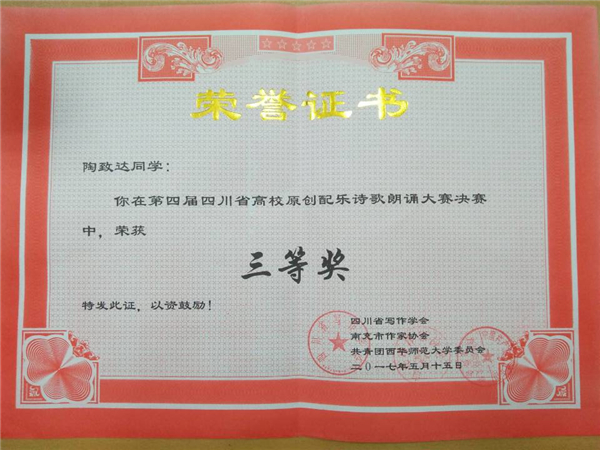 2017年5月13日,四川省第四届原创诗歌配乐朗诵大赛决赛在西华师范大学隆重开幕。内江师范学院、西华师范大学、川北医学院、四川师范大学等12所高校参与了此次活动。我院辅导员许小涛老师带队参加比赛。