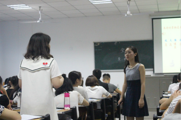 在比赛过程中,通过参赛选手的一言一行和所讲授的课程,可以看出她们经过了精心准备,也看得出初为人师的认真负责。其中,3号选手李施怡以课文《当你老了》为题,以音乐导入课程,采用合作探究、教师引导及诵读的方式引导学生完成教学内容。并对诗歌中的假设、照应、象征、意向等手法进行细致分析。接着,评委老师谭永燕与她交流了诗歌中的感情基调。其他几位选手表现也十分出色,赢得了现场观众的阵阵掌声。通过同学们的一言一行和所讲授的课程可以看出,他们是经过了精心准备,也看的出初为人师的认真负责,