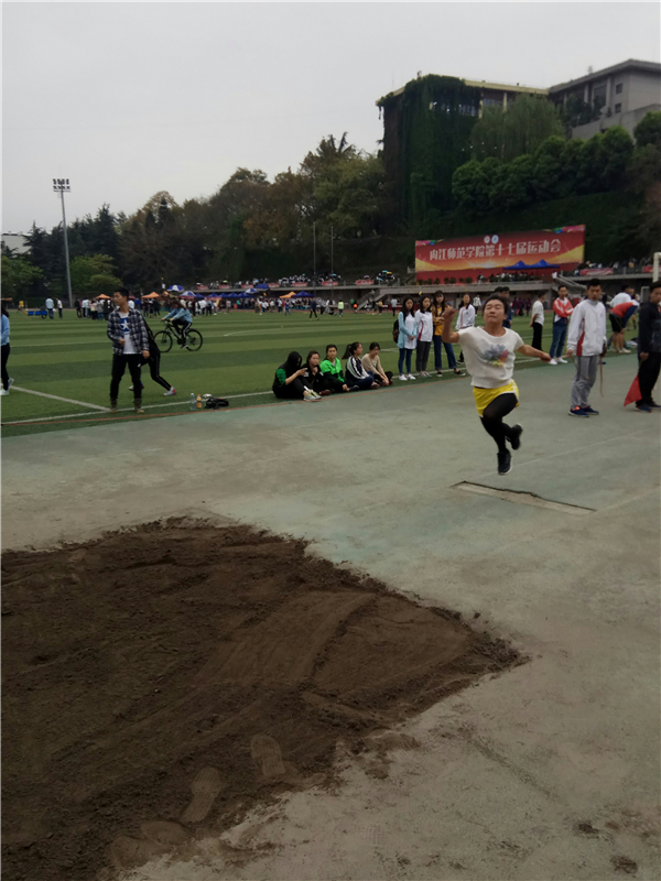 虽然在昨夜气温骤降,但没能磨灭选手们心中的热情。开赛前,各位运动员都做了充分的热身准备。压腿,伸展跳等准备活动完毕,随即开始激烈的比赛。助跑、起跳、奋力一跃,这过程虽短,但这一跳里有包含了近日训练的无数汗水。伴随着观众的呐喊,沉着冷静的陈静,将三级跳远的助跑、跳跃完美展现,可惜落地时略有失误,影响了比赛状态。随后参赛的尹璨同学,神情有些紧张,身旁的同学们也为她隐隐担忧,为她奋力加油打气。裁判旗挥下的瞬间,她弯腰,抬头,发力,箭也似地向沙坑飞去,抬脚、再跳,只听得一声沉重的闷响,她倒在沙坑中,停了几秒,留给观众许多惊诧。