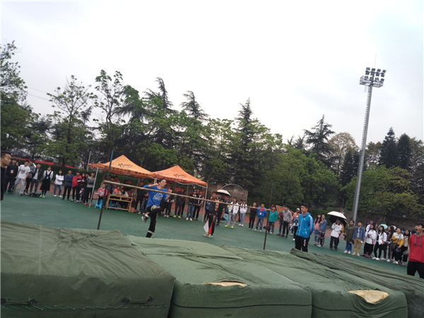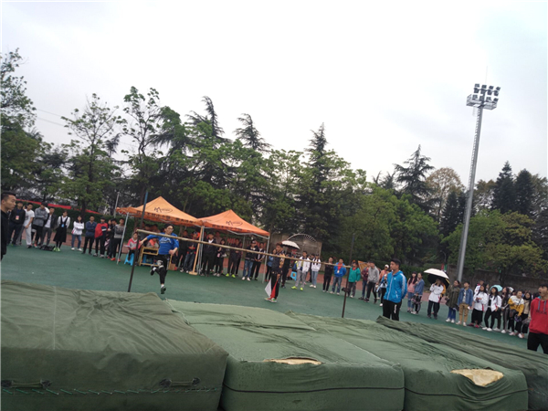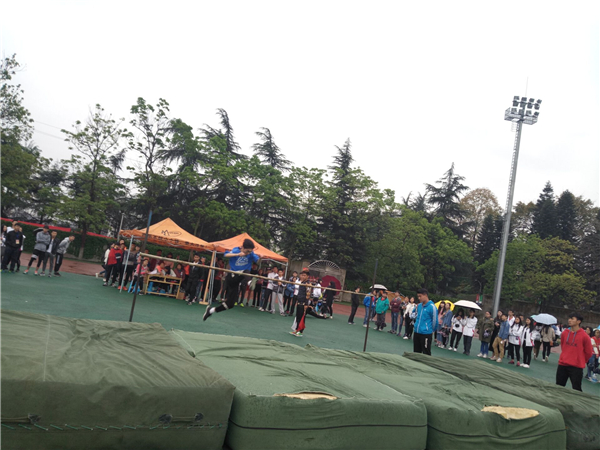 深呼气,起跑,纵身一跃,跨杆,落地。凭借高超的技术,刘达如一只穿梭在柳叶间灵巧的燕子,轻松跃过了1.3米的横杆。但是,另外两名选手杨凯龙和杨国峰两位同学虽然用尽全力跳跃,却心有余而力不足,三次试跳都失败了,无缘接下来的复赛。作为学院的最后一抹希望,18号选手刘达压力剧增,他深呼一口气,在一旁压腿舒展,做好提前准备活动。随着裁判的红旗挥下,他稍微弯腰,猛的发力,像脱膛的子弹,飞快的向横杆冲去,只听“砰”的一声,他整个人就砸在安全垫上,1.35米的横栏被他征服了。但是在接下来的跳高比赛中,他一次次试跳,碰掉横杆,跌倒在海绵垫上,爬起来,继续助跑,起跳。1.4米的横栏最终成为了他进入决赛的拦路虎,被挡在进入决赛的门口。