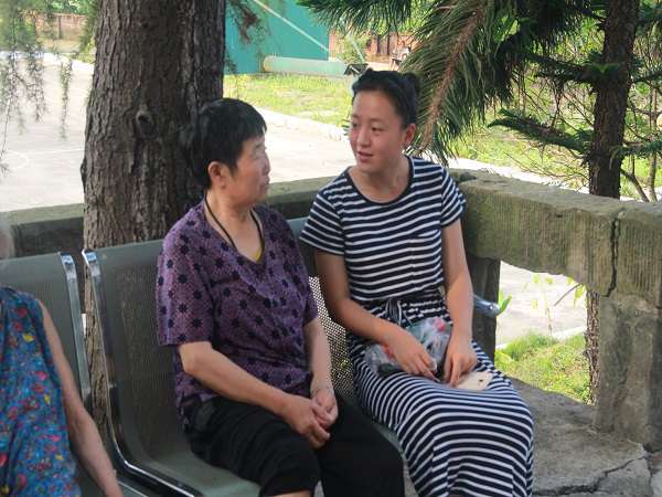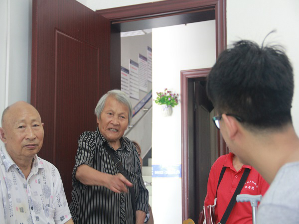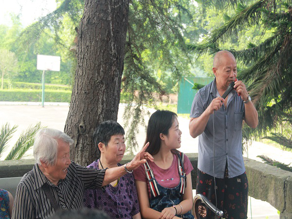 吃了早饭,许多老人已经在外面散步或者坐着休息。队长袁苗赶紧让大家分散到不同地方去陪伴老人们聊天。任主任拿出了话筒和音响,让大家陪老人唱歌活跃活跃气氛,已是88岁高龄的陈婆婆身体健朗,精神矍铄,酷爱唱红歌,一听队员们要唱歌,陈婆婆非常兴奋,和大家大声地合唱起《军中绿花》、《没有共产党就没有新中国》、《十送红军》等家喻户晓的歌曲。当唱到《红军战士想念毛主席》时,陈婆婆几度哽咽,无法唱下去,眼中涌起层层泪花,见状大家都非常感触,陈婆婆说道:“我想起看到毛主席睡在水晶棺,心里难受······”,才知道这位老人曾是一位对党对国家忠心耿耿的革命战士,经历过解放战争那些时候的艰苦岁月,革命情、战友情、爱国情深深镌刻在了她的骨髓里,她深深地爱着国家,崇敬着着国家领导人,这样的感情,是老军人特有的一种情怀,永远不会随着时间的流逝磨灭。陈婆婆即使有时精神有点异常,对周围的事情记不得弄不明,但她唯一不忘的也只有曾经作为战士的每一段记忆。