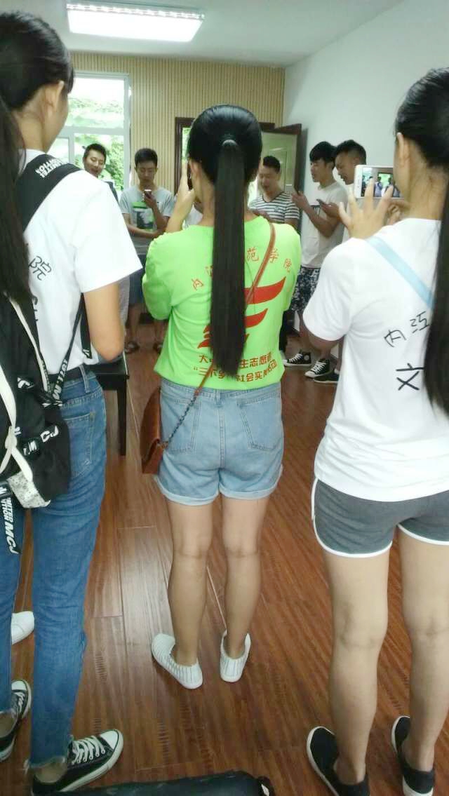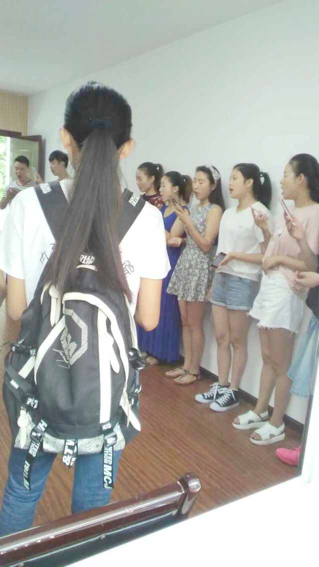 我们站在窗外,拿好自己的手机,找角度拍摄照片。队长带着几个平时爱好摄影,技术挺不错的小伙伴进了练习室里,跟拍他们唱歌。当红歌一首首的传来时,我们的精神也仿佛荡漾在那美丽的歌声中。在录前几首歌时,途中有几次歇息,有人从里面出来,透气。他们用好奇的眼光看着我们,我们觉得很不好意思。后面文工团的小伙伴们,为我们唱了一首《十送红军》,那调子宛转悠扬,韵味深长,且朗朗上口,让人忍不住跟着哼唱。