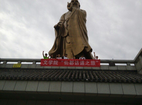 7月16日上午9点,调查队一行人来到了显灵山老子像前。老子像高24米,金色漆身,参悟天地的手势寓意着天地和谐,万物归一。此外,我们在老子像前偶遇西安文理学院教授李晓煜。