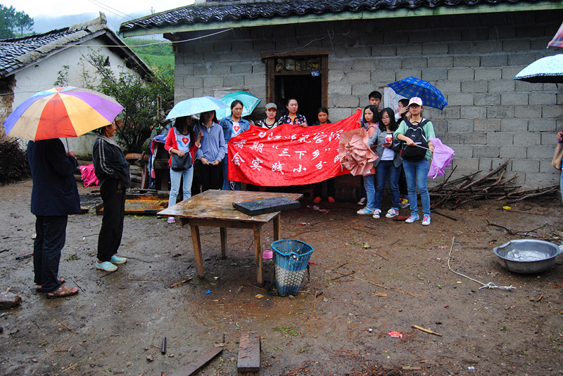 走了十多分钟,队伍到达了第一户贫困人家。这是一户坐落在山坡上的土墙房屋,可能是为了节省筑房开支,这个小屋矮小而狭窄,门前破旧的院落因为一场细雨变得泥泞不堪,眼前破旧颓败的场景这让队员们始料未及。征得户主同意后,队员们以口头采访的形式有礼貌地询问了家庭成员数量、经济来源、生活状况和政府福利等问题,最后送上了礼物略表心意。采访中细心的队员们发现,这户人家的三个孩子都是我们所负责班级的学生,而且成绩和综合表现很好。
