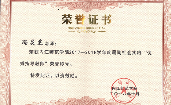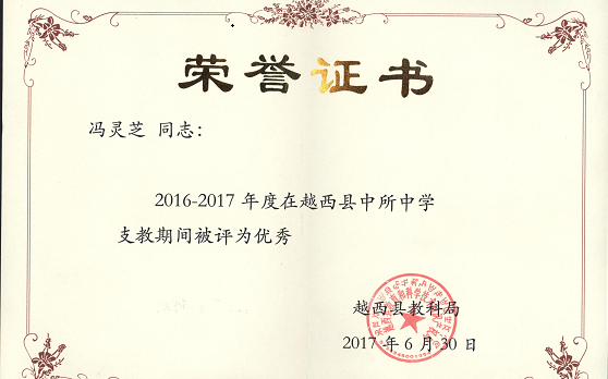 回望来路,就是这样,冯灵芝老师用她的善良纯真和对教育的热爱,努力在支教和育人工作中担当起青年教师的责任,像一轮太阳给人以温暖,像一块磁石吸引着更多青年学子融入到新时代的洪流中去。2017年7月,冯灵芝被越西县教育局授予“优秀教育工作者”荣誉称号,同年9月,她被评为内江师范学院“优秀教师”,2018年11月,她获得授课班级学生“我最喜爱的教师”提名,并被评为内江师范学院暑期“三下乡”社会实践“优秀指导教师”。在年度社会实践表彰大会上,她在发言中谈到:“我想,我们可以更深地影响一些孩子,总有一天,我们会影响到更多的孩子。”