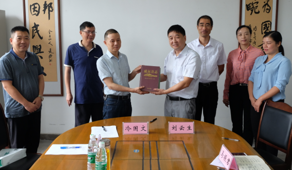 仪式上双方互赠成果,合影留念。