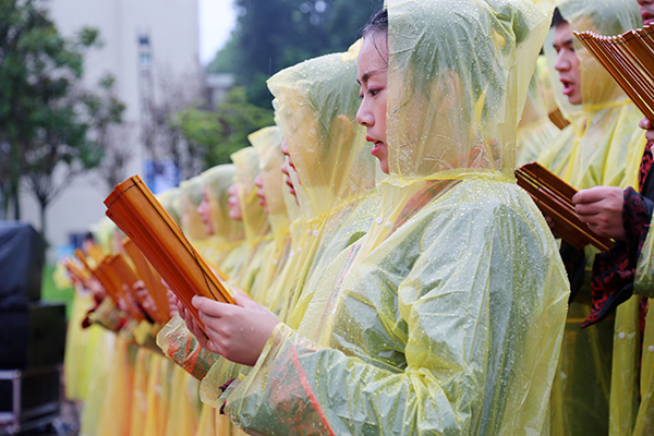 巍巍上庠,观国之光。久道化成,儒教央央。崇礼尊师,圣学弥彰。9点40分,下课铃响,天一广场主祭场准备就绪。虽然天公不作美,但雨幕下的祭礼更显庄重诚笃。在肃穆厚重的古乐中,两名引领官引导身着正装、佩戴祭孔专用黄色绶带的献礼代表缓缓入场。鼓乐起,雄浑有力的鼓点响彻广场上空。132名礼生整齐洪亮的诵读,36名礼生庄严大气的佾舞,把现场氛围迅速点燃,祭孔典礼正式开始。
