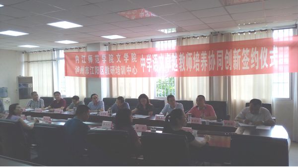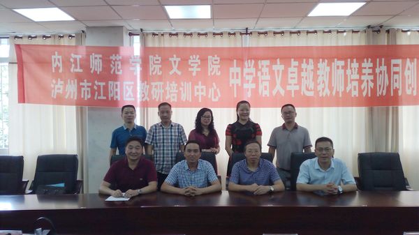 9月12日,内江师范学院文学院、泸州市江阳区教研培训中心举行“中学语文卓越教师培养协同创新项目”签字仪式。内江师范学院、泸州市教科所、市教育局综改办、江阳区教育局、江阳区教研培训中心、泸州市初中语文名师陈邦工作室等单位领导和教师20余人参加了会议。签约仪式由内江师范学院教务处副处长汪在荣主持。