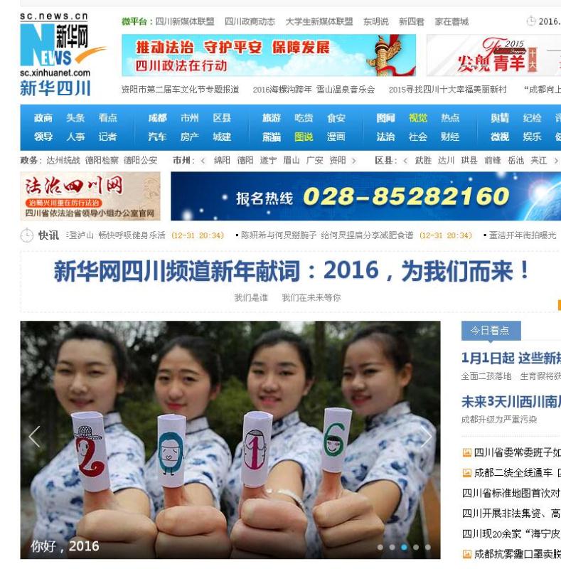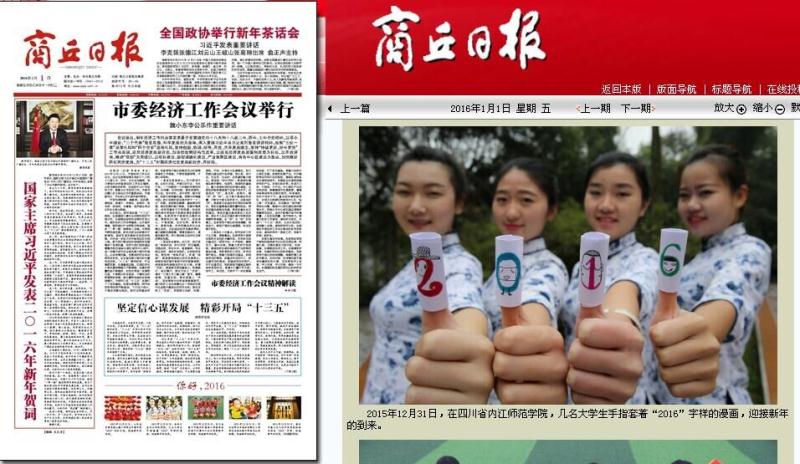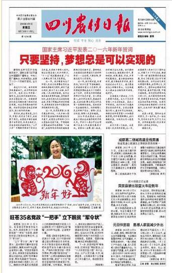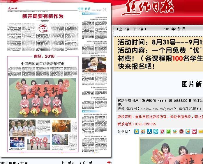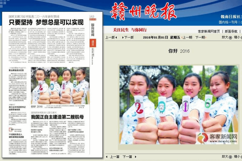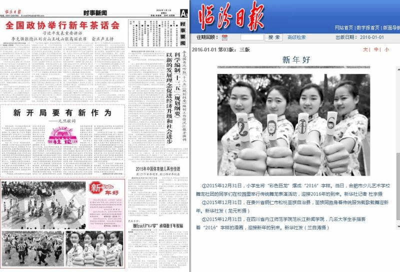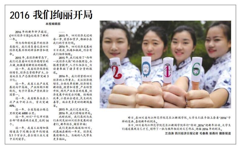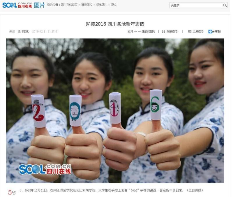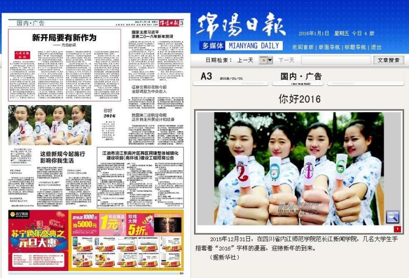 学子们通过自己的一双巧手,创作了一批与新年相关的手工文艺作品,迎接2016年到来。喜庆的剪纸、吉祥的春联……这些充满着中国风的特色作品均表达出了我院学子们对2016年的美好向往。四名女大学生身着青花图案的旗袍,一字排开,用漫画玩偶的方式手绘出“2016”字样,古风与个性相结合,告别2015,迎接2016。据悉,该活动得到多家媒体的关注,新华社、搜狐网、亚洲新闻图片网等多个网站纷纷报导和转载了此次活动。继新华社、搜狐网、凤网、北方新报、亚洲新闻(Asia newsphto)、四川在线、视觉四川等网络新媒体报道我院喜迎新年活动后,南方都市报、四川经济日报、四川农村日报、临汾日报、汕头特区晚报、赣州晚报、京江晚报、无锡新传媒、焦作日报、绵阳日报、渤海早报、鹤壁日报、平顶山晚报、商丘日报等纸媒分别以头版头条报道该项活动,喜迎2016……!