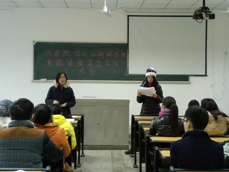 最后,范老师就学校针对寒假期间留宿学生准备的座谈会、团拜会等一些列活动进行了说明,并叮嘱留校同学要互相关心,互相帮助,与家人、辅导员老师、班主任、同学经常保持联系,碰到问题及时反映汇报。