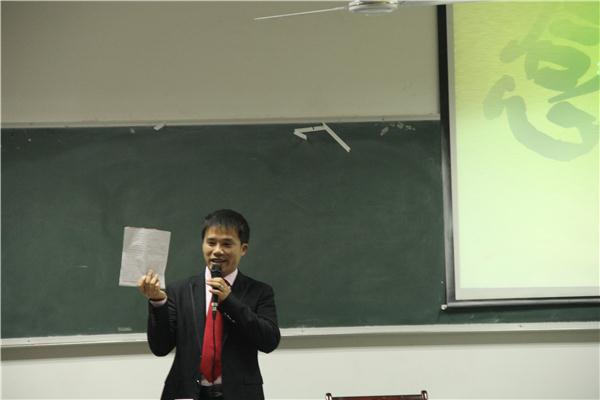 第二部分是“孝道中于事君之悟”,即服务社会。他提出“世界以痛吻我,我以歌报之”的观点要学会坚强的面对挫折。同时,他表达了自己“机遇在于自己创造把握未来的细节”和“价值大于价格”的看法。程老师举着自己的亲身经历:“我曾经尝试写30封自荐信,却只有3个人回信,而回信人之一,就是邓国军院长。后来,我站在了这里。”他告诉着在座同学机遇与努力的重要性。