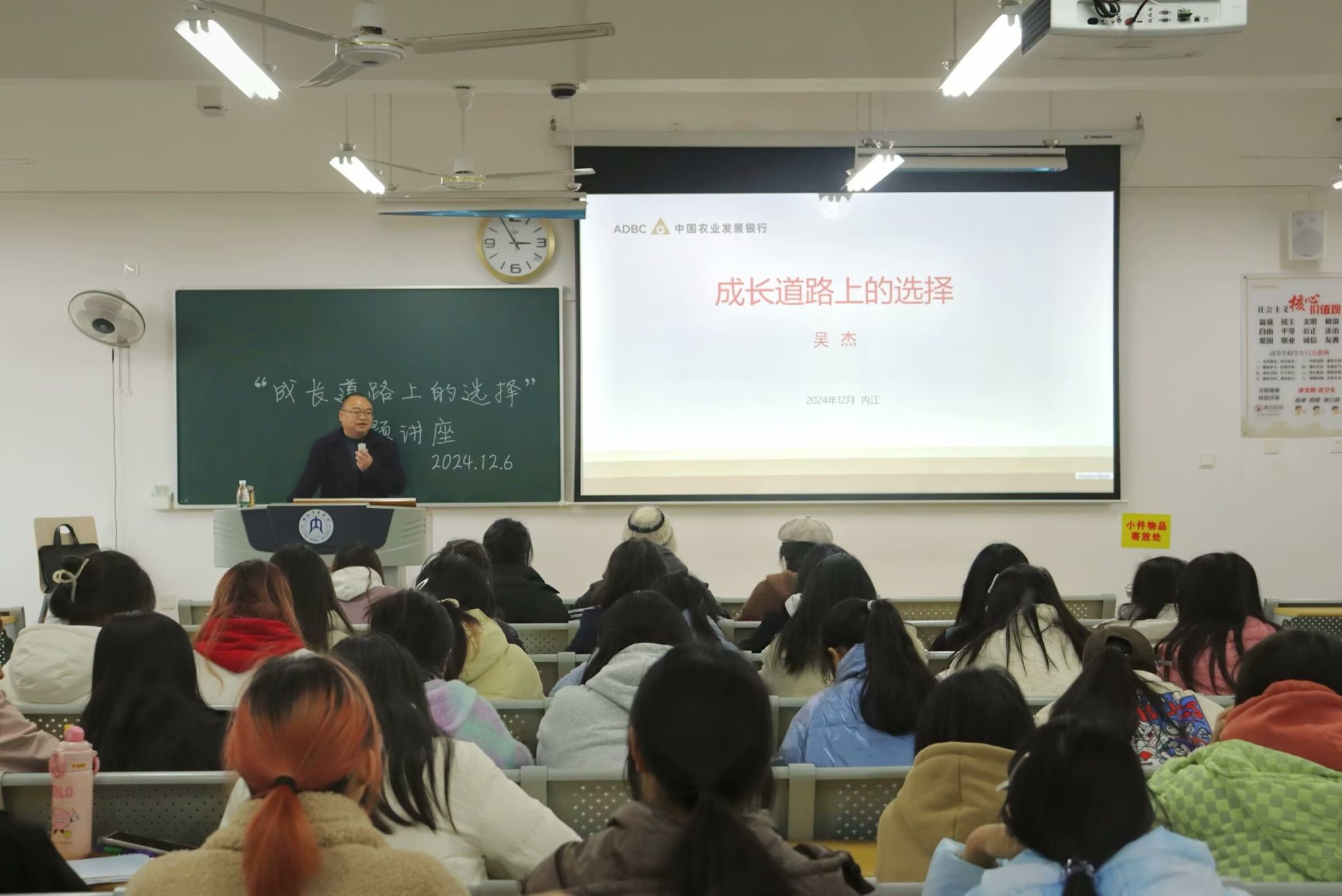 吴杰讲述了他的求职之路:初入职场对未来的懵懂、项目攻坚的艰难、转型期的迷茫与探索。让同学们深刻感受到了成长之路的艰辛。随后,吴杰结合自身经历,条理清晰地分享成长必备技巧,提出利用碎片化时间学习、化解人际矛盾、洞察行业趋势等建议,同学们纷纷拿出笔记本认真记录。讲座尾声,吴杰深情寄语同学们“人生要为自己负责”,走上无悔的成长之路。