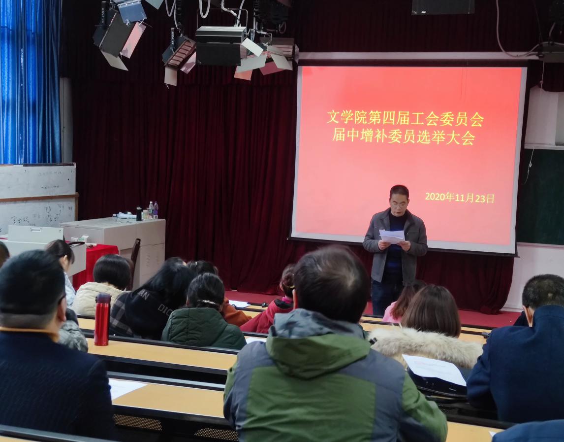 为进一步加强学院工会组织自身建设, 2020年11月23日下午2点30分,文学院工会依据《工会法》、《中国工会章程》及相关规定,依法召开了学院第四届工会委员会届中增补委员选举会议。会议由学院党总支书记李达军主持。