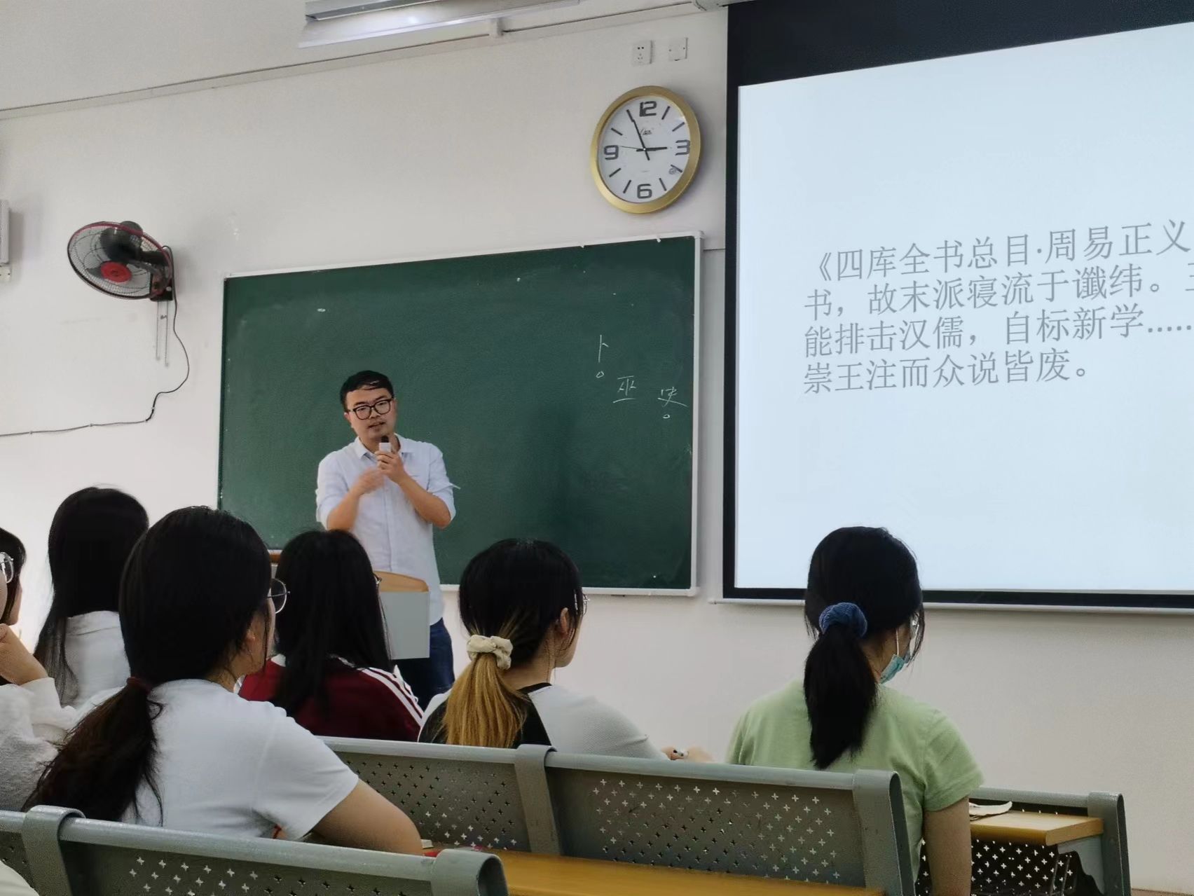 吴文庆博士以“因天象以教人事——《周易正义》导读”为题,带领学生对《周易正义•乾卦》部分进行逐字逐句地文本细读,梳理经传注疏的内在关系与阐释空间。比如乾卦象天,但为何此卦不谓之“天”,而用“乾”。因为天是体,乾是用。《说卦》云:“乾,健也”。而圣人作《易》本以教人,欲使人法天之用,不法天之体。课后,老师们对吴博士的讲课提出了一些问题,讨论了原典教学的优点和必要性。