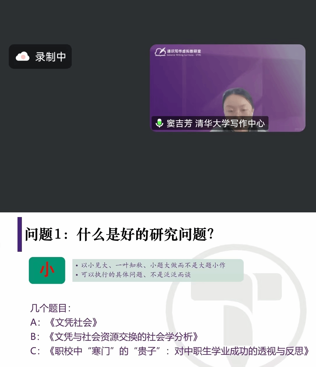 “云上教研”第一轮教研活动的主题是“如何提出一个好问题---通识写作课的写作选题教学”。众所周知,选题是学术写作的“灵魂”,它决定了写作的方向和目标,有学者甚至认为,确定了一个好的选题,基本就完成了写作任务的80%,如何通过课程内容和教学方法的设计,引导本科学生提出一个好问题,并培养学生的创新意识和批判性思维能力,是写作课的重难点之一。4位老师从自己丰富的学术写作经验和教学经验出发给大家作了深刻而又生动的讲解。