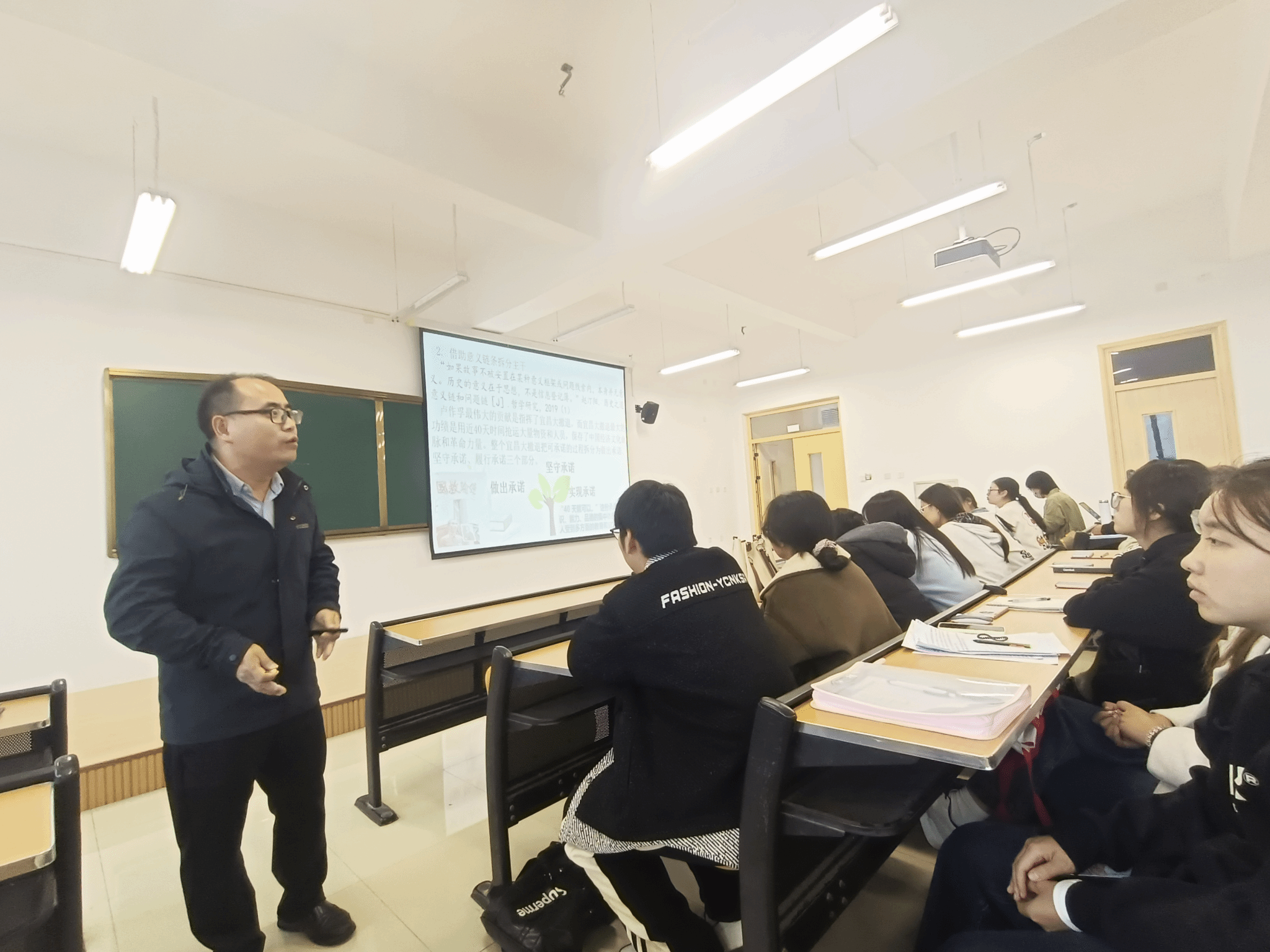 刘川江老师首先对该课程的研究价值、研究过程、研究成果等方面做了系统的思政创新汇报,然后进行了主题为“基于问题链进行‘家乡人物志’写作学习活动”的课堂教学活动展示,课堂中刘老师的教学环节主要围绕着“如何借助问题链认识家乡人物志”“如何借助问题链写作家乡人物志”“如何借助问题链指导学生写作家乡人物志”三大主问题展开。在认识家乡人物志的教学过程中,刘老师从“问题链”“人物志”的概念入手,分析了家乡人物志的真实性、文学性、文化性等特点,并以杨振宁先生的《邓稼先》一文为例详细分析了家乡人物志的主要内容。在写作活动中,刘老师借助问题链对写作中的“删除枝蔓”“区分主干”“添枝加叶”等具体写作流程进行了展示,给学生带来丰富的启示。刘川江老师将课堂教学与实际应用相结合,循序渐进,调动了同学们的积极性,带领同学们走进写作教学的理论深处,打造了一个高效愉悦的课堂,充分展示了深厚的文学理论素养和精湛教学水平。