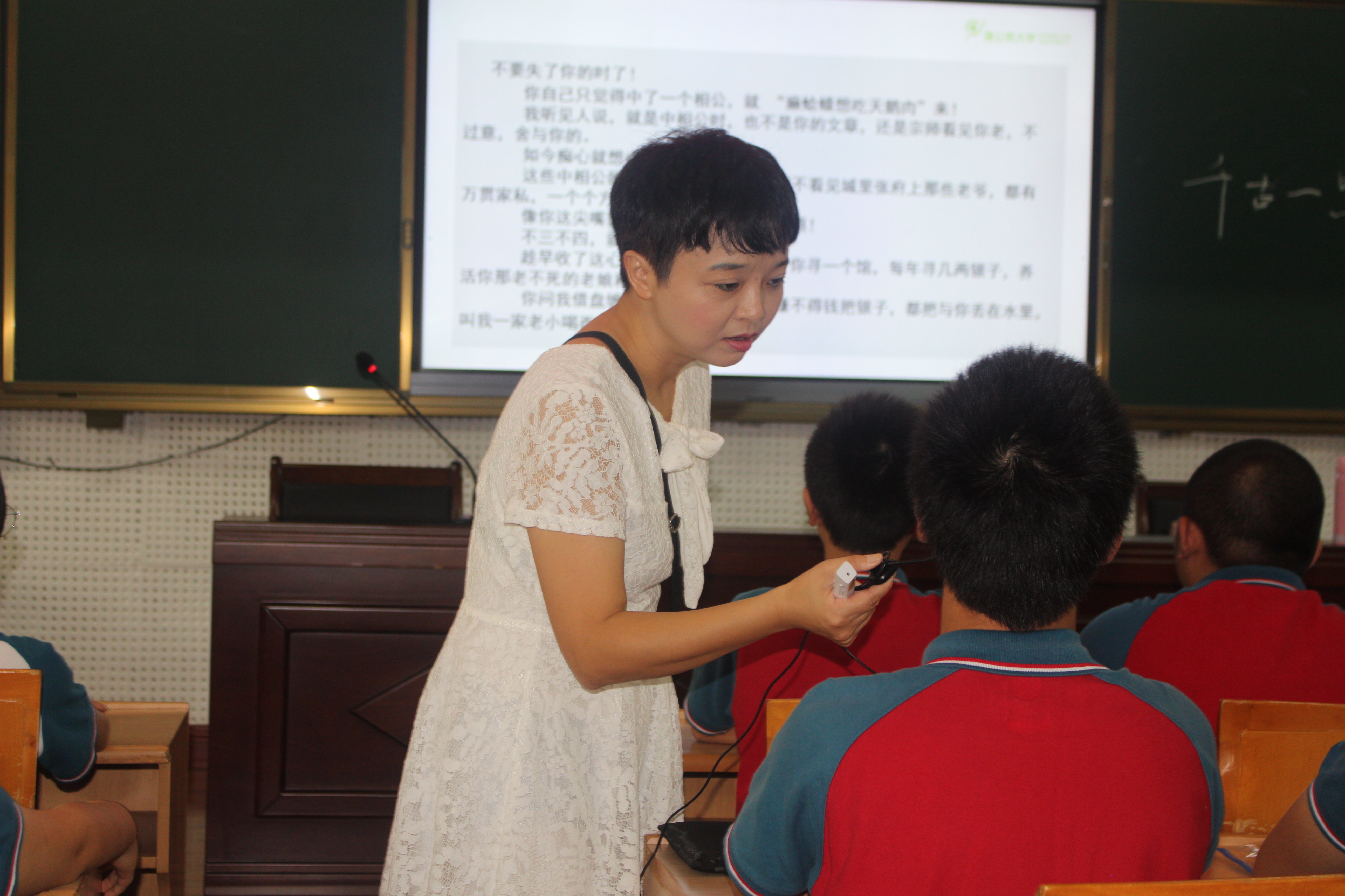 片刻休息后,她以“沟通”二字为主要关键词,结合自身经验强调语言表达交流的重要性,同时她还以《孙权劝学》一文为例,通过宏观主题式阅读的方式进行探索和学习有效沟通的方式方法,以此来研究上下级间、同级之间以及英雄与英雄间的交流方式。她指出,一个人只有在语言交流中学会“不生气”,才能在将来的生活中成就大事。