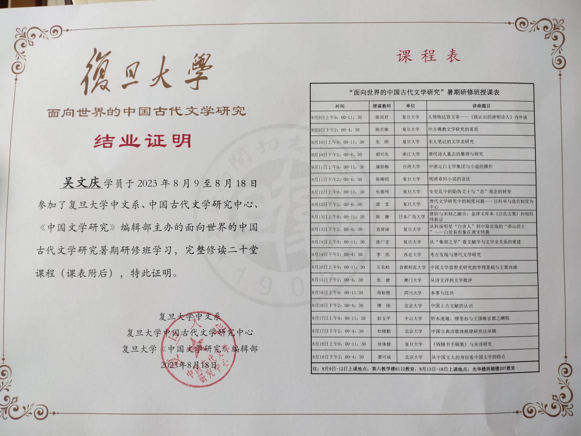 2023年8月8日至8月18日,文学院吴文庆博士参加复旦大学 “面向世界的中国古代文学研究”暑期研修班。